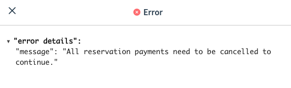 The popup closes and a “RESERVATION HAS BEEN CANCELLED” confirmation message displays in red on the reservation details page. | ![]() |