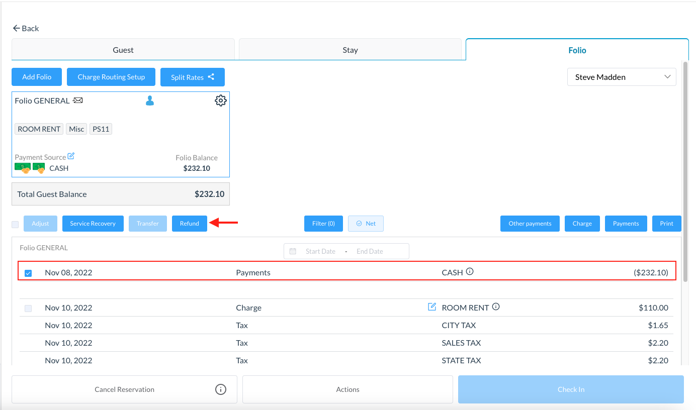 Select the folio item to be refunded. In the example at right the guest has made a prepayment of $232.10 in cash and now wishes to cancel the reservation. When at least one folio item greater than $0 is selected, the Refund link activates. Select Refund. | ![]() |