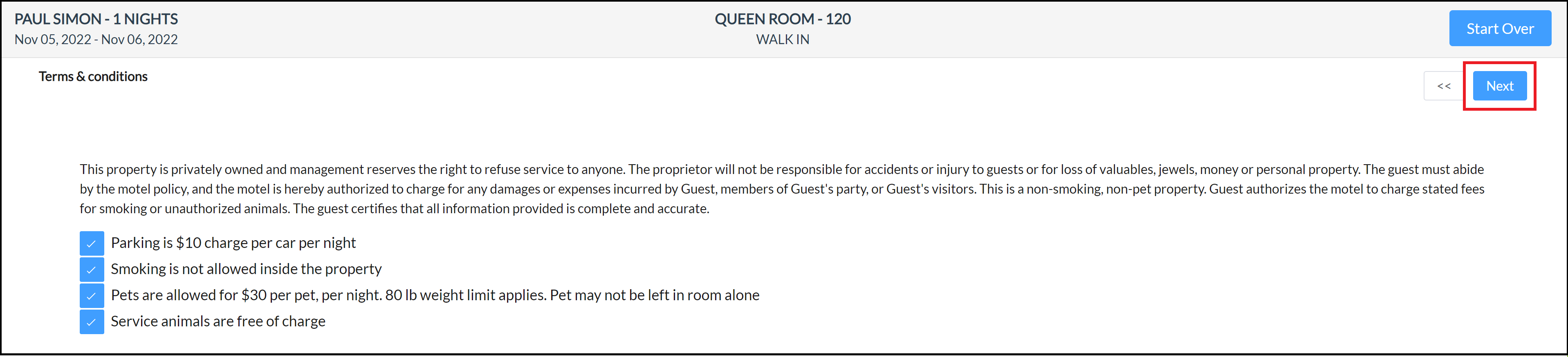 The Terms & conditions panel loads. Ask the guest to review the terms and conditions item and select each box to confirm agreement with each item. When all items are selected, select Next. | ![]() Terms and Conditions Panel - Blank ![]() Terms and Conditions Panel - Filled |