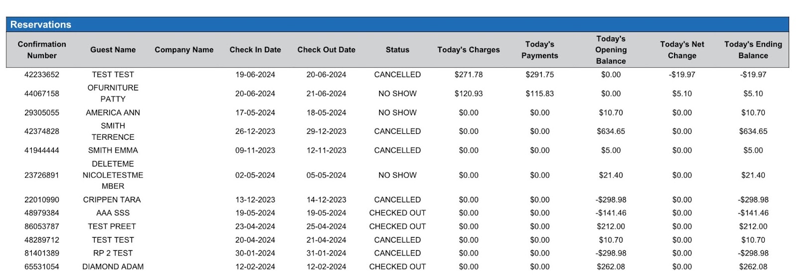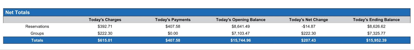 Today’s Net Change | Indicates changes made on the reservation (payments or charges posted) *If payments posted, net change will be negative *If charges posted, net change will be posted | YES | =sum(today’s charges) - (today’s payments) |