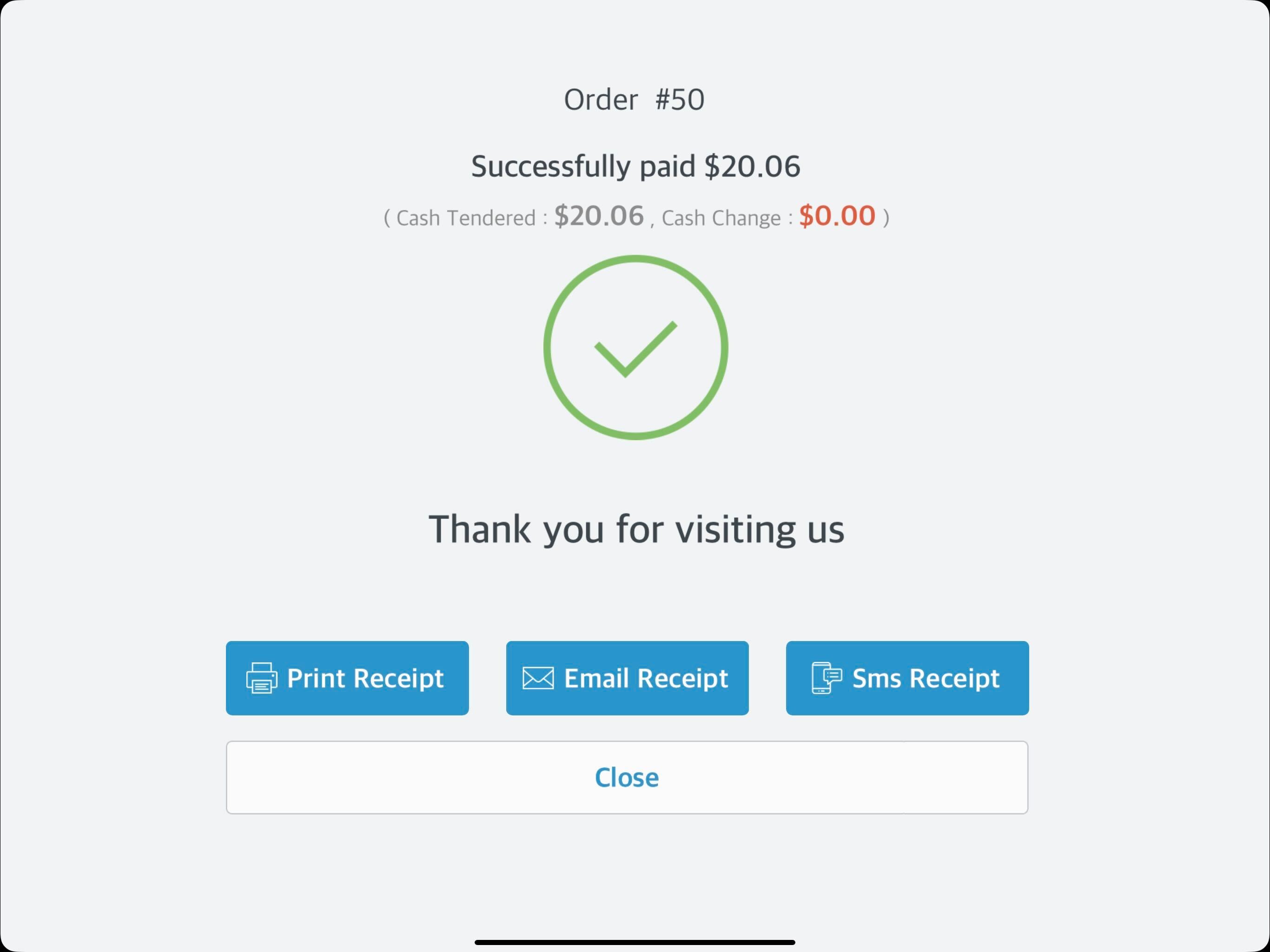 A payment confirmation message displays. From here the receipt can be emailed or printed. Select Close to close the confirmation message. | ![]() Payment Confirmation Message - Print, Email and Close Links |