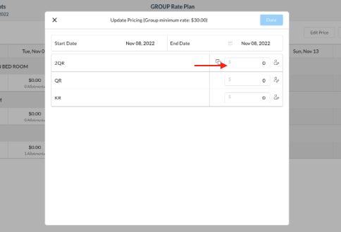 The Update Pricing popup loads. Update the pricing for the room types by entering the amount in the blank space shown on the screen besides the person icon | ![]() |