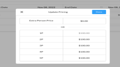 Click on the person icon to define pricing for extra persons, fill in the amount and click on Done Note - entering an amount in the Extra Person Price field will auto populate the remaining field amounts for all additional person counts. Enter pricing separately for each person to differentiate | ![]() |