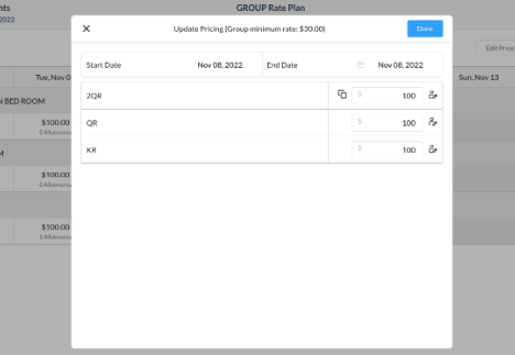 After entering pricing for Extra Persons, the initial update pricing screen populates. Click on the copy icon on the first room type and rate will auto fill the pricing for all the room types listed. Once all room types have an associated room rate, the Done button is activated - click on it to proceed Note - should you wish to add different pricing for each room type, simply enter the dollar value associated with the room type and update the additional person pricing for each, if applicable | ![]() |