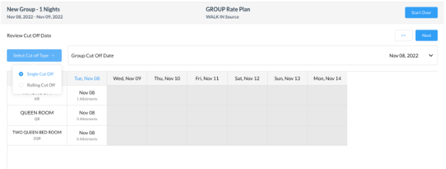 The Group Rate Plan - Rate Calendar Panel loads, displaying Room Type and pricing details. Review the room types and rates for each Select Next to continue. | ![]() Group Rate Plan - Rate Calendar Panel |
