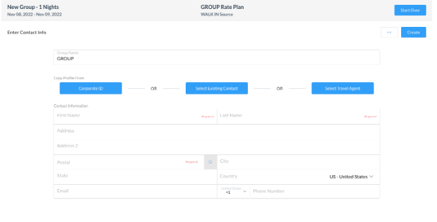 The Enter Contact Info panel loads. Enter details for the group’s designated contact person. Select Create to create the group master You can also copy the profile from Corporate ID, Existing Contact, or an associated Travel Agent | ![]() |