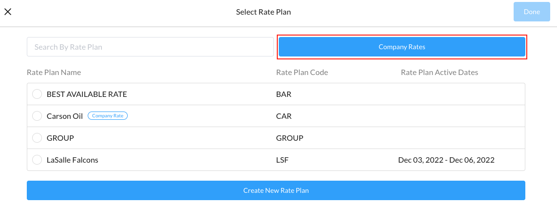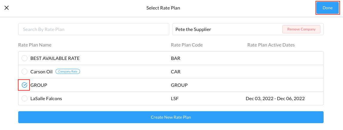 Select Rate Plan screen opens again. Choose the radio button for the associated Company rate plan - if applicable - or select Group rate plan for companies that are not configured to use their negotiated rate for groups, then click on Done | ![]() |