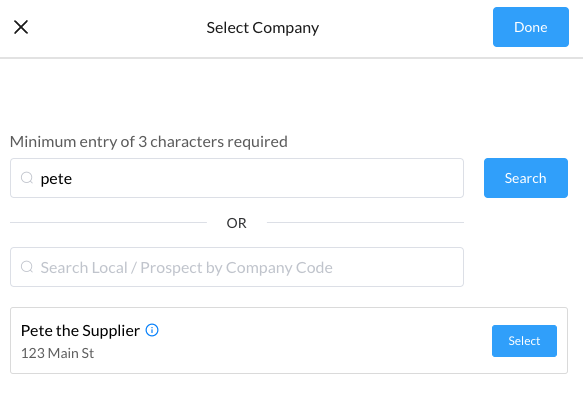 Select Company screen opens Search for the company in the search bar and click on Select | ![]() |