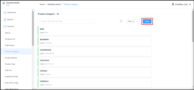 The Product Category page loads. Select New. | ![]() Product Category List Page – New Link |