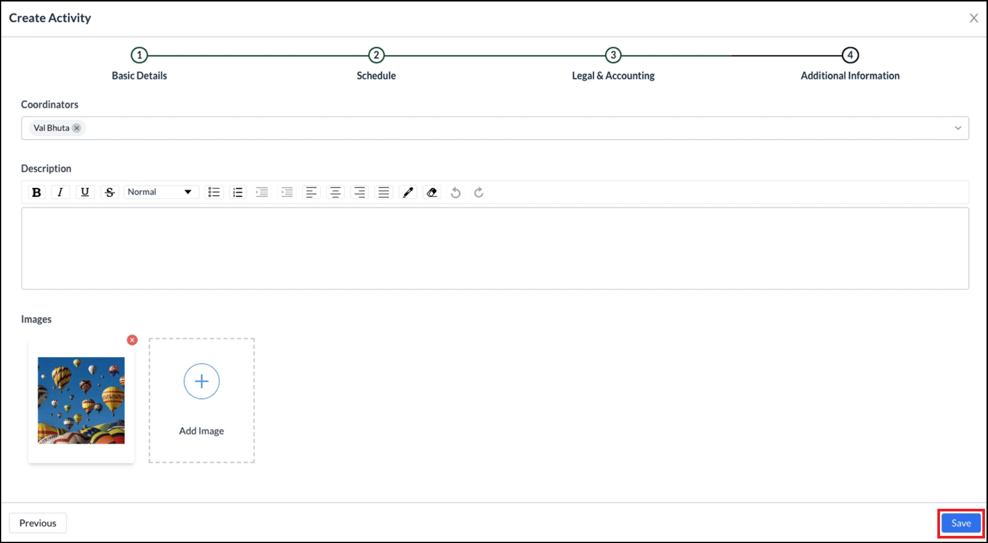 The wizard advances to the Additional Information panel. Select a Coordinator for the activity, and optionally enter an activity Description. Select the plus sign in the Add image box to upload an image to associate with the activity. Note that additional image upload boxes populate as each image is uploaded, multiple image uploads are possible. Select Save to create the activity. | ![]() Additional Information Panel, Blank ![]() Additional Information Panel, Filled |