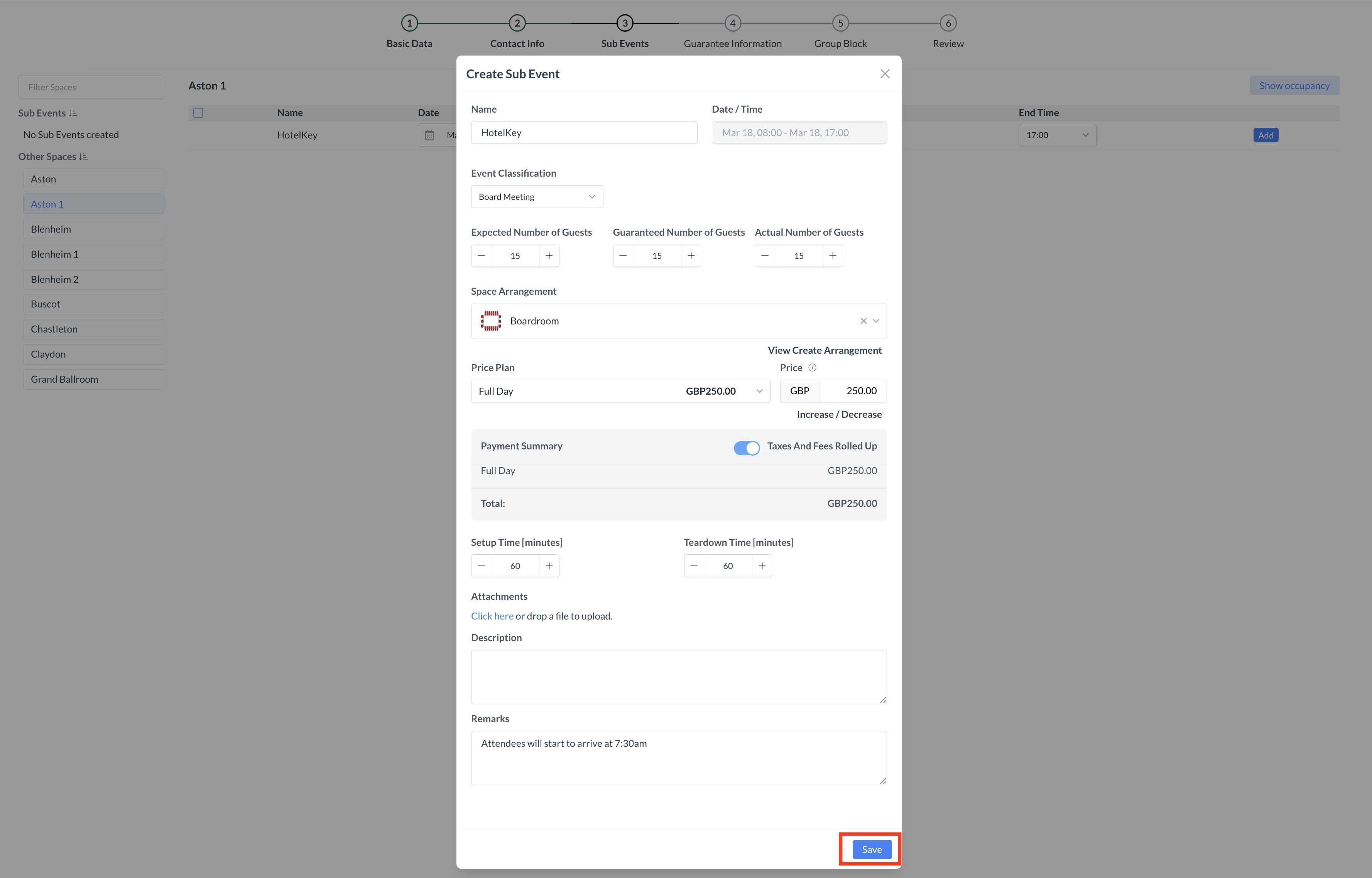 6. Enter Setup and Teardown TimeSpecify how much time is needed before and after the event for room setup and cleanup. 7. Add Attachments (Optional)Attach any relevant documents such as floor plans, AV instructions, or client notes. 8. Enter Event Description and Remarks