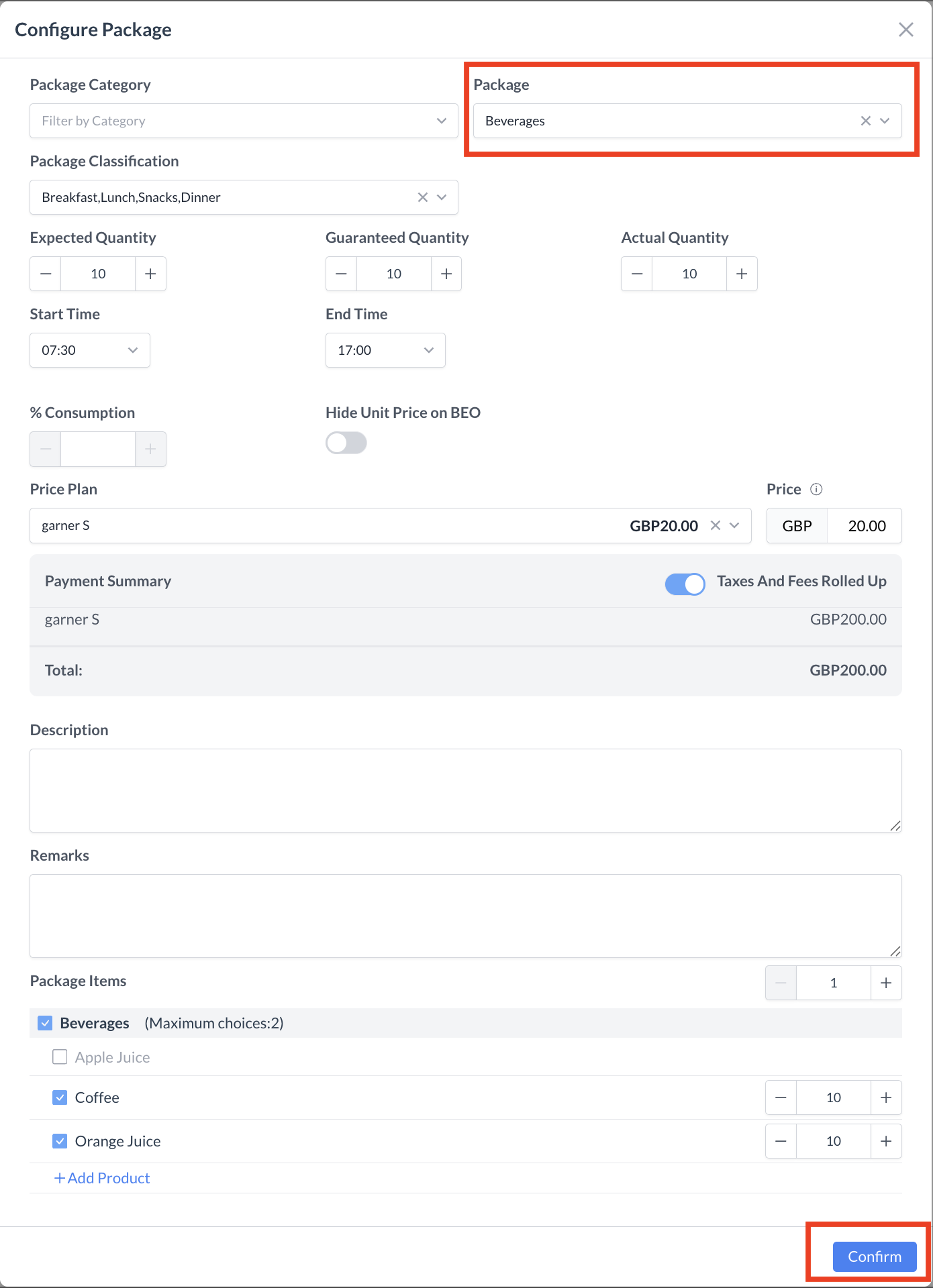 These notes are visible on the BEO. 10. Configure Package ItemsUnder Package Items, you will see the menu and associated products included in the selected package.