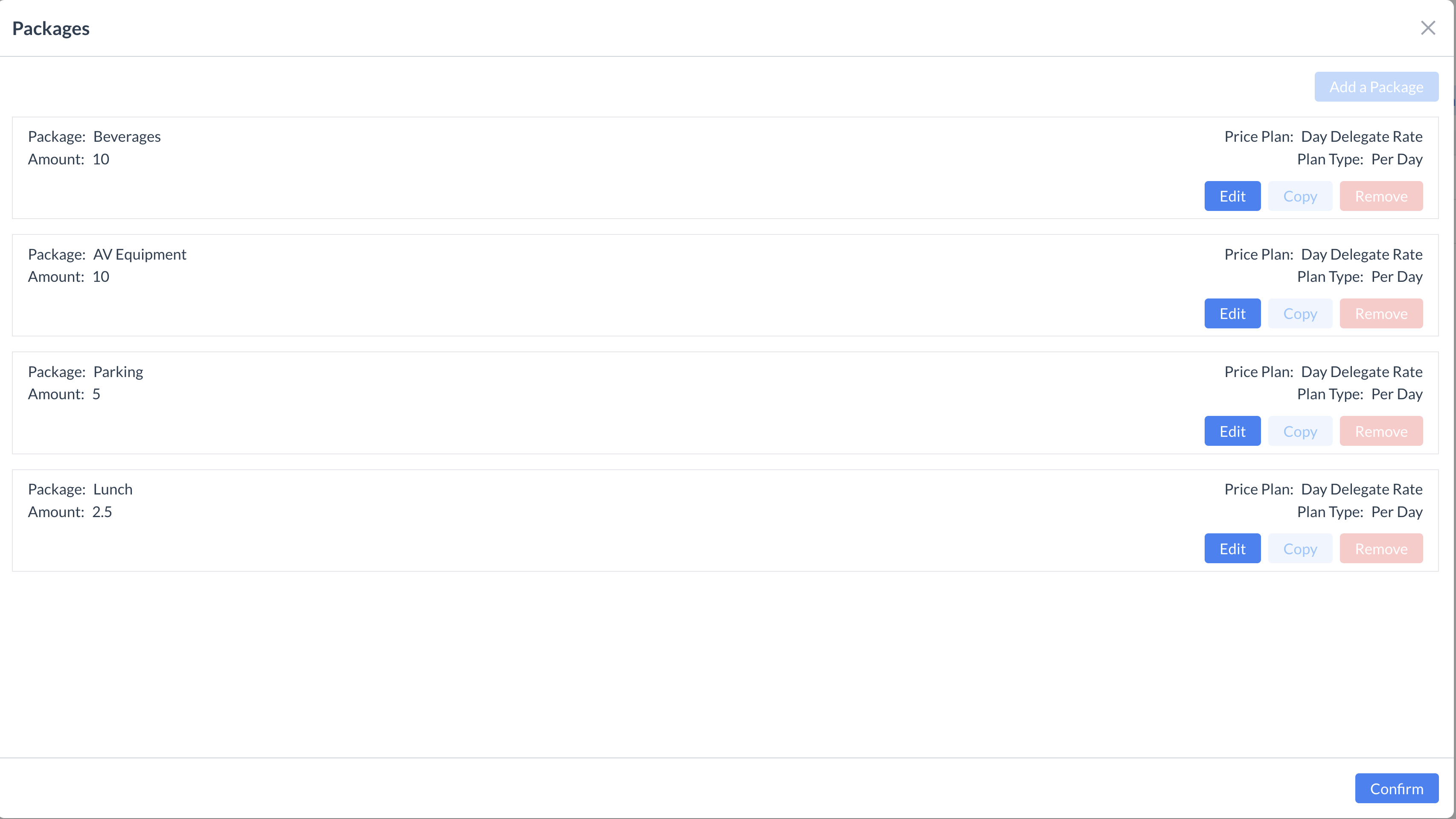 When you have finished adding all required packages, click the blue âConfirmâ button to proceed to the next step. | ![]() Package Screen |