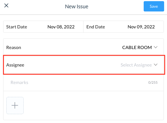 In the Assignee field, select the assigned maintenance engineer. Optionally, add remarks in the provided text field. Optionally, select the plus sign icon to upload an image of the issue. Select Save to create the new issue. | ![]() |