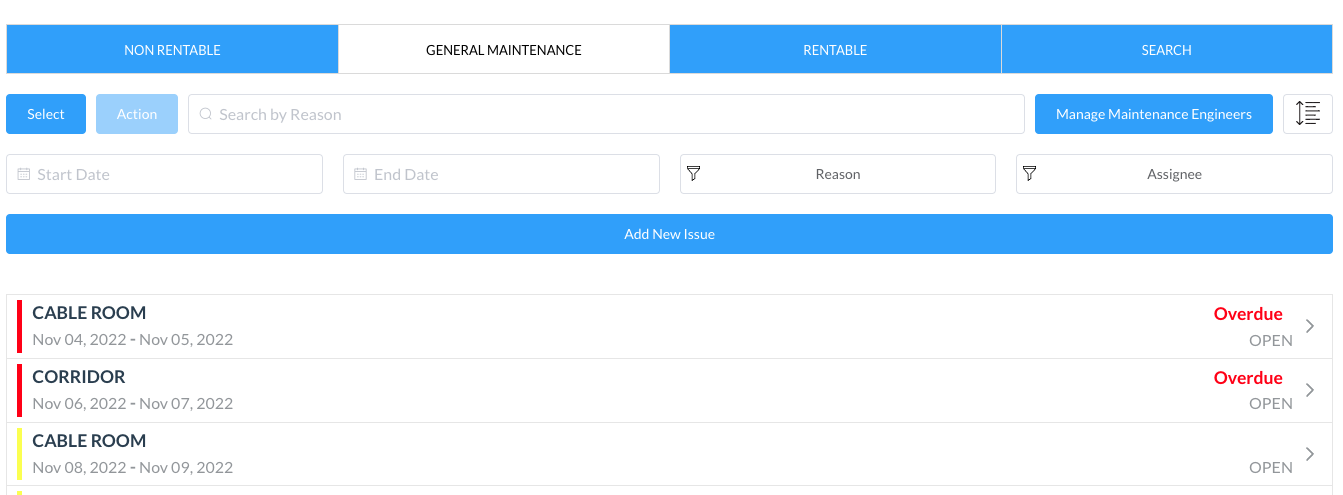 The popup closes and the issue is added on the NON RENTABLE page. Note that rooms that the fix is overdue are grouped in Red and issues that are open are grouped in Yellow | ![]() |