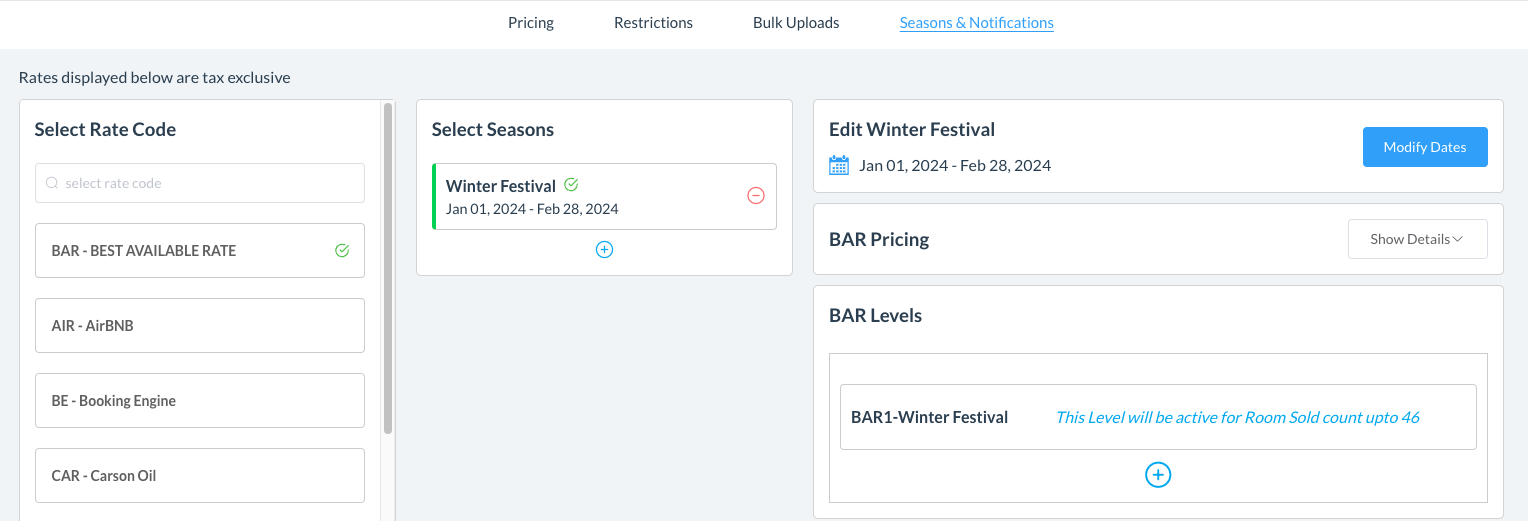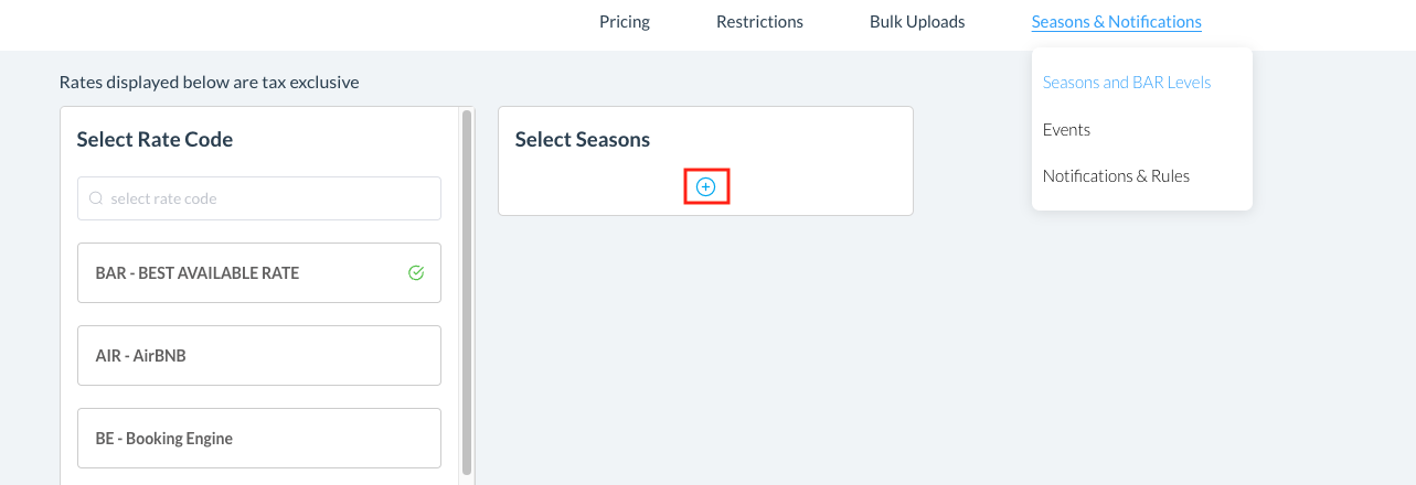 Select the Seasons & Notifications menu First, choose the Rate Code you wish to create the new season then Seasons and BAR Levels, select the plus (+) sign to begin creating. | ![]() |