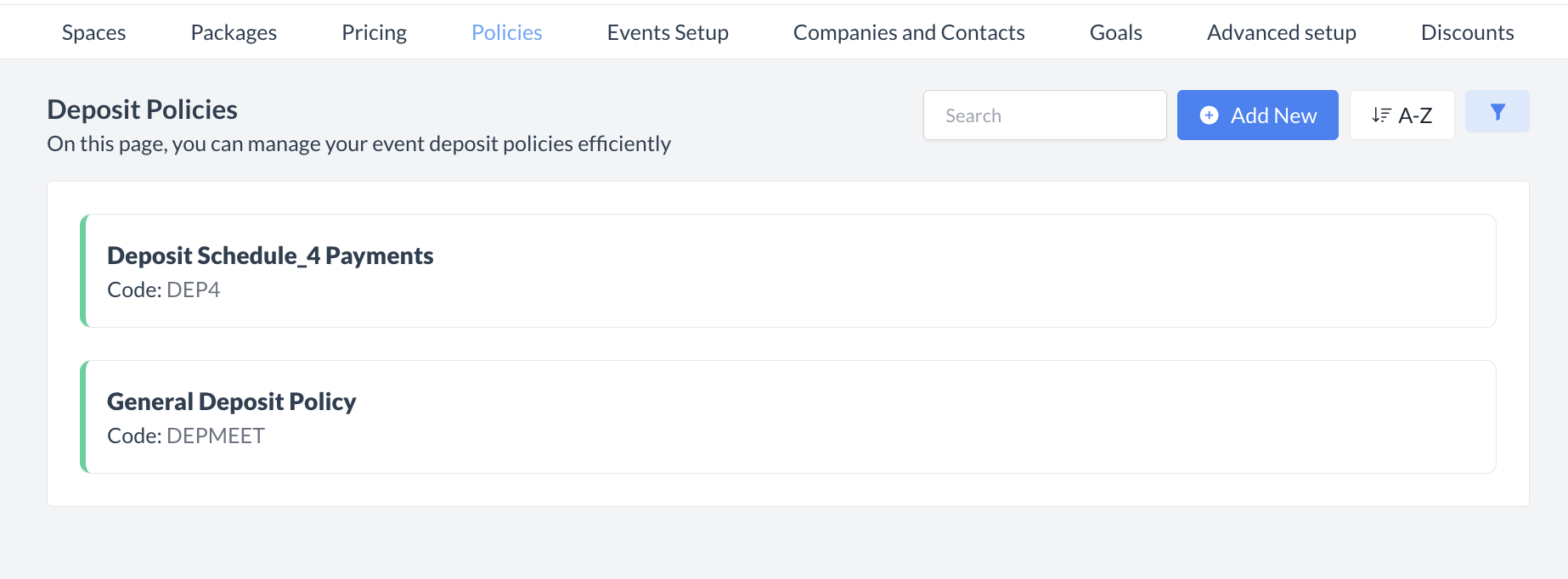 Navigate to Home > Event Administration > Policies > Deposit Policies | ![]() Policies > Deposit Policies | |||||||||||||||