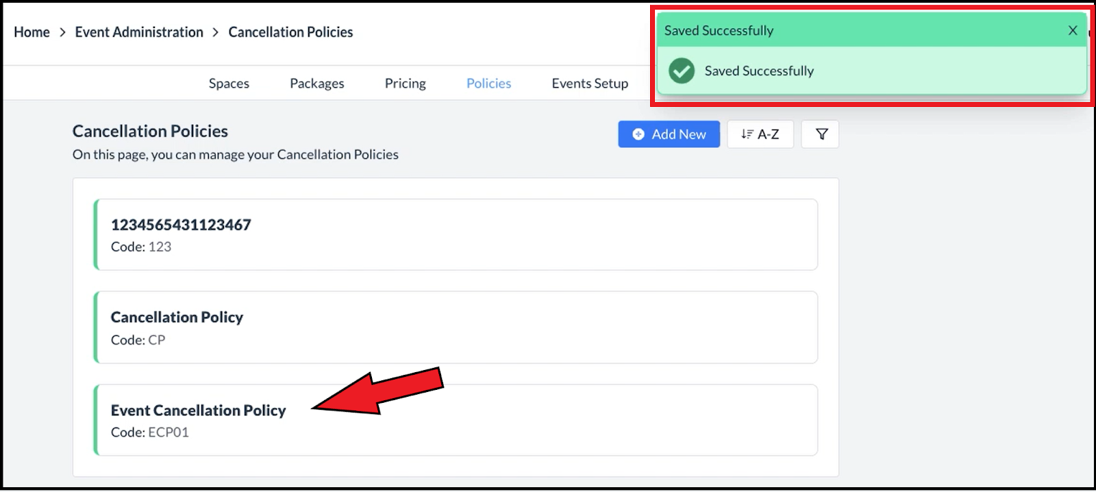 The popup will close and a success message will be displayed, indicating that a new Deposit Policy has been added to the list. |