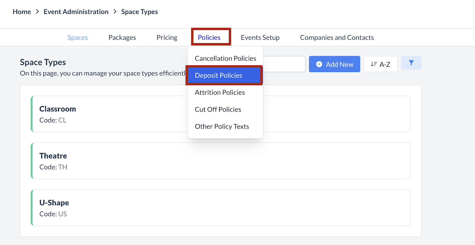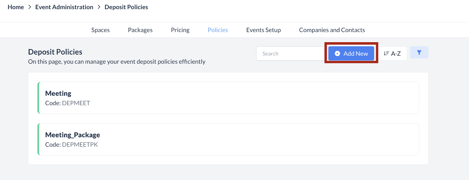 Select Deposit Policies from the Policies menu. The Deposit Policies page will be displayed. | |