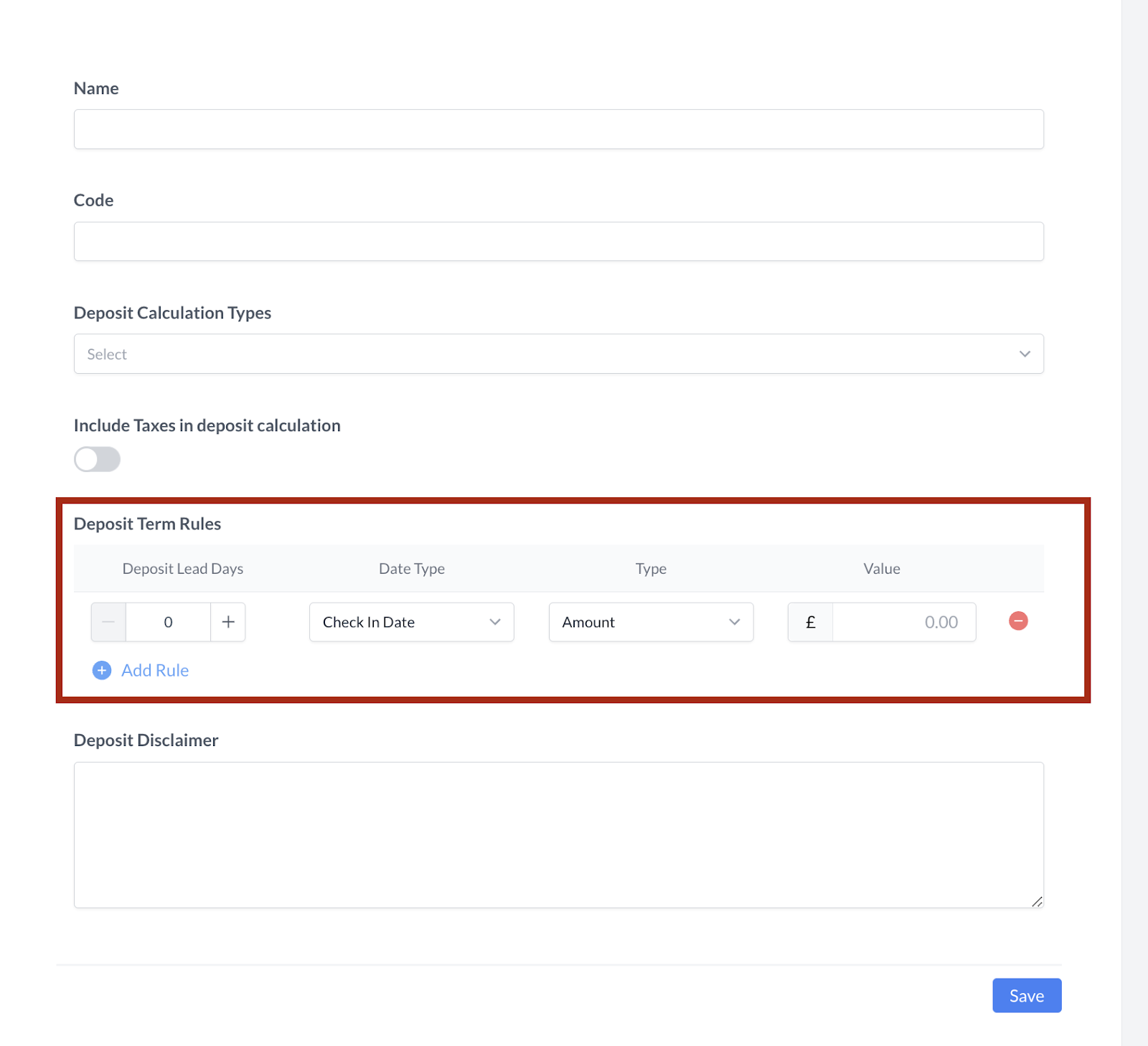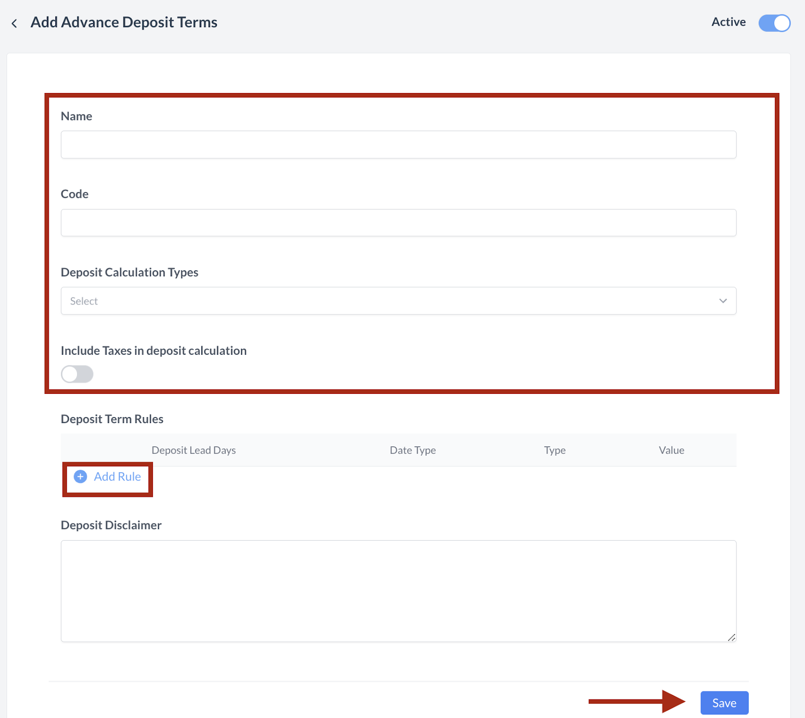 Complete the Advance Deposit Terms section. Deposit Term Rules: Select the blue Add Rule Button The Deposit Rules will appear for completion. Select Save. | |