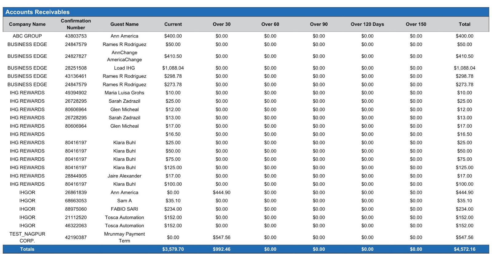 Accounts Receivables section: provides a detailed list of transactions by company and aging group that have not been invoiced.
