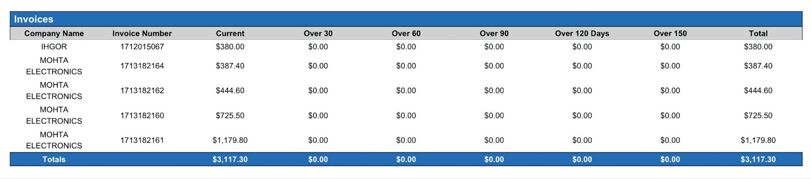 Invoice section: provides a detailed list of invoices by company and aging group that have not been settled.