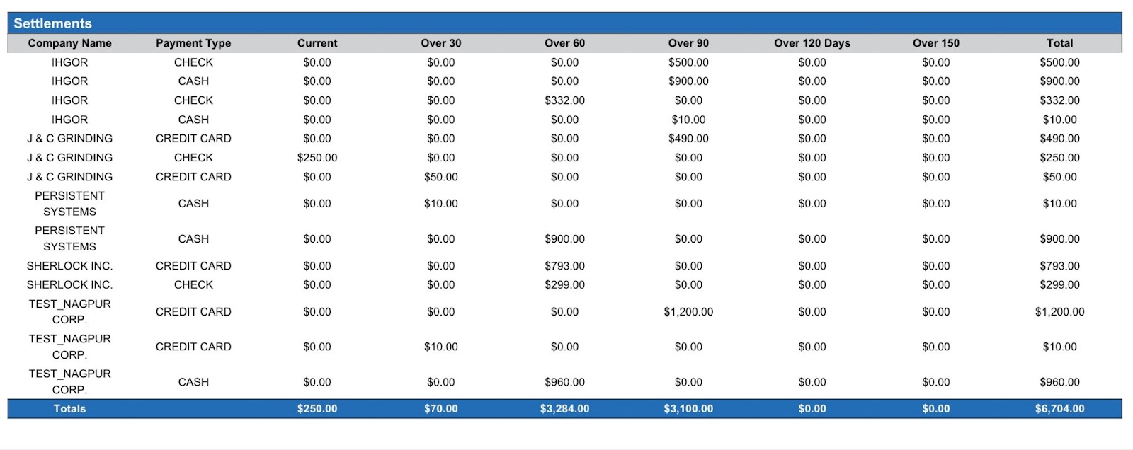 Settlements section: provides a detailed list of applied settlements (payments) by company and aging group.