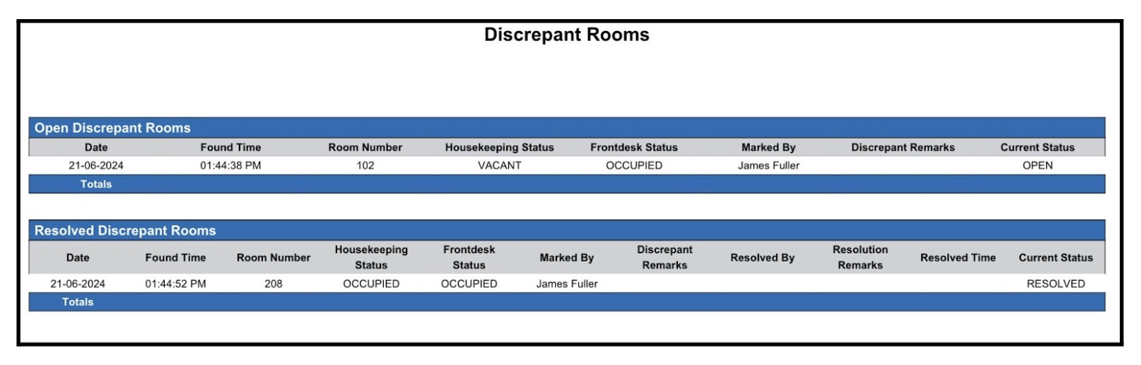 Report Description: The Discrepant Rooms Report compiles information on rooms where discrepancies exist between the occupancy status reported by housekeeping and the status recorded by the front desk. The Discrepant Report provides a list of rooms where disparities exist between the occupancy status reported by housekeeping and that recorded by the front desk. It assists staff in identifying and resolving such discrepancies promptly to ensure accurate room status information.