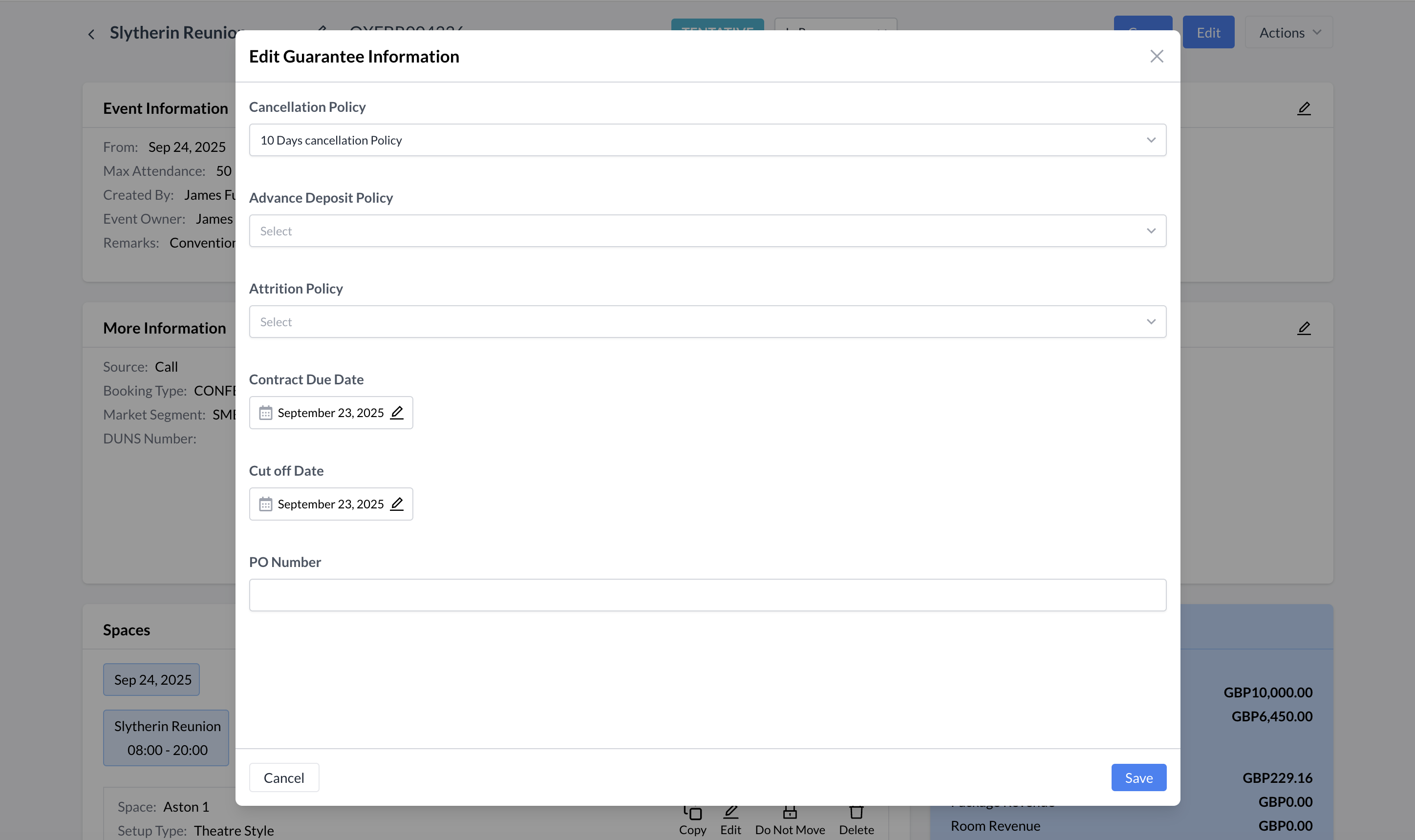When you click the Quick Edit button—such as in the Guarantee Information section—a dedicated edit screen will appear. This screen allows you to modify the specific fields within that section of the Event Reservation. Once you've made the necessary updates, click the blue "Save Changes" button to apply your edits and return to the main Event Record. | ![]() Edit Guarantee Information Screen |