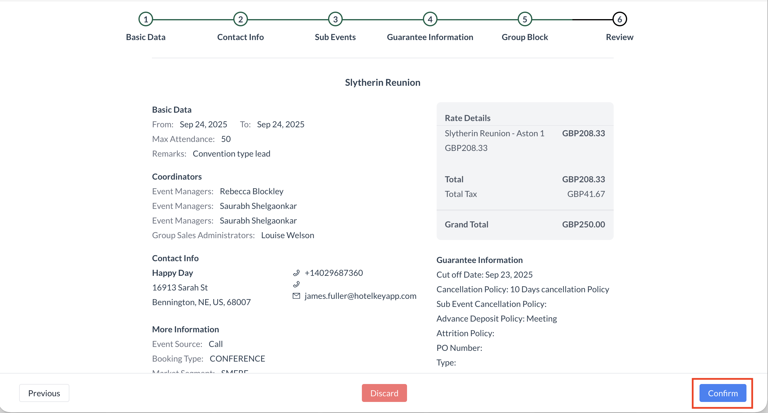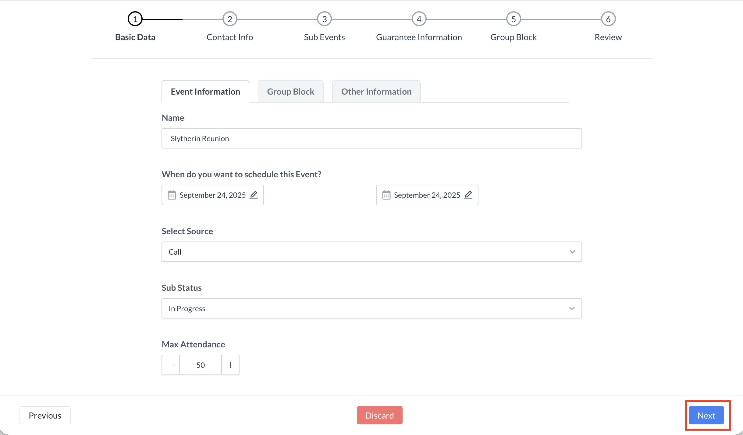 This method is ideal for making comprehensive edits that span multiple sections of the event, such as updating event dates, room blocks, or catering details. ⚠️ Important: While in the six-step event creation flow, you must click the blue "Next" button on each step to proceed through the process. At the final step—the Review screen—click the blue "Confirm" button to save your changes. This will complete the editing process and return you to the updated Event Record screen. | ![]() Event Reservation - Edit Flow ![]() Six-Step Event Creation Flow ![]() Six-Step Event Creation - Review Screen |