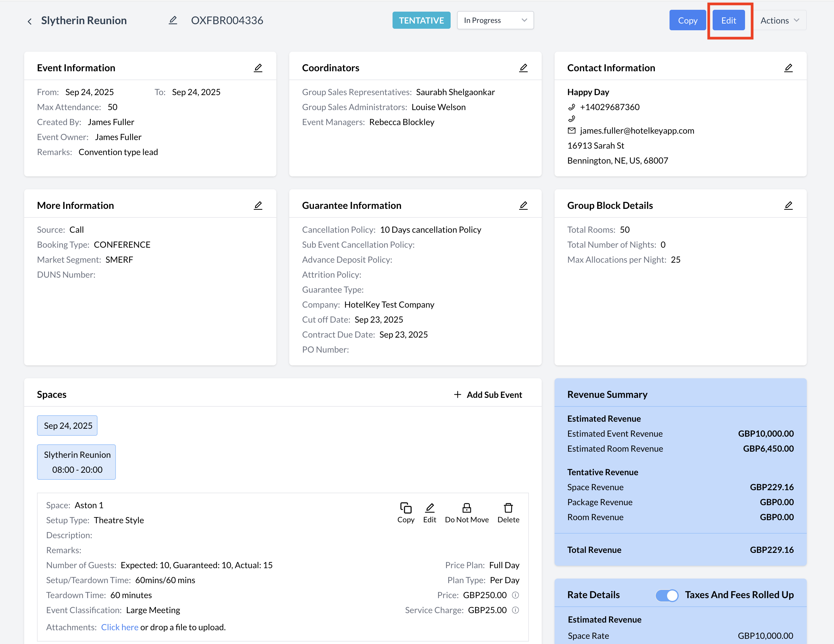 When you edit an Event Record, you are making changes to one or more of these fields to reflect updates requested by the client, internal adjustments, or operational needs. These edits help ensure that all departments—Sales, Catering, Banquets, and Operations—are aligned on the most current version of the event.