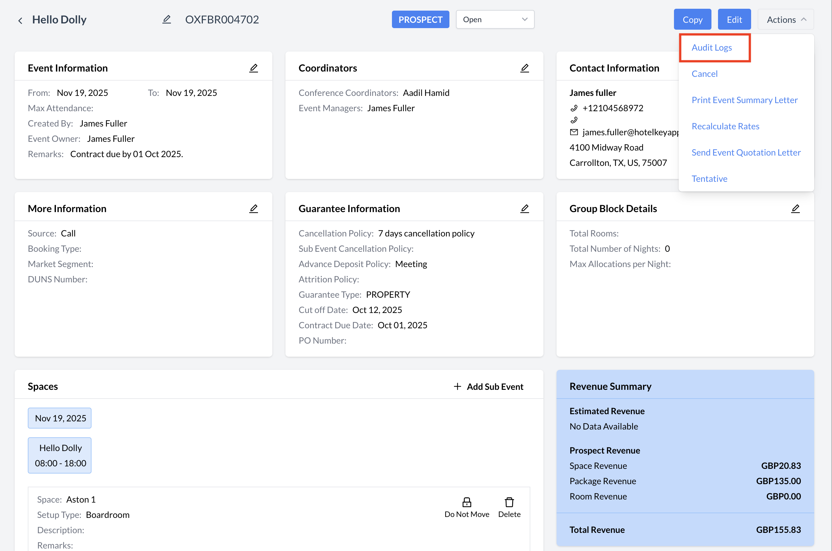 Audit Logs are typically accessible to users with appropriate permissions and are available within the event record (reservation). By utilizing Audit Logs, users and management can maintain confidence in the integrity of event data and support a more organized and accountable event planning process.