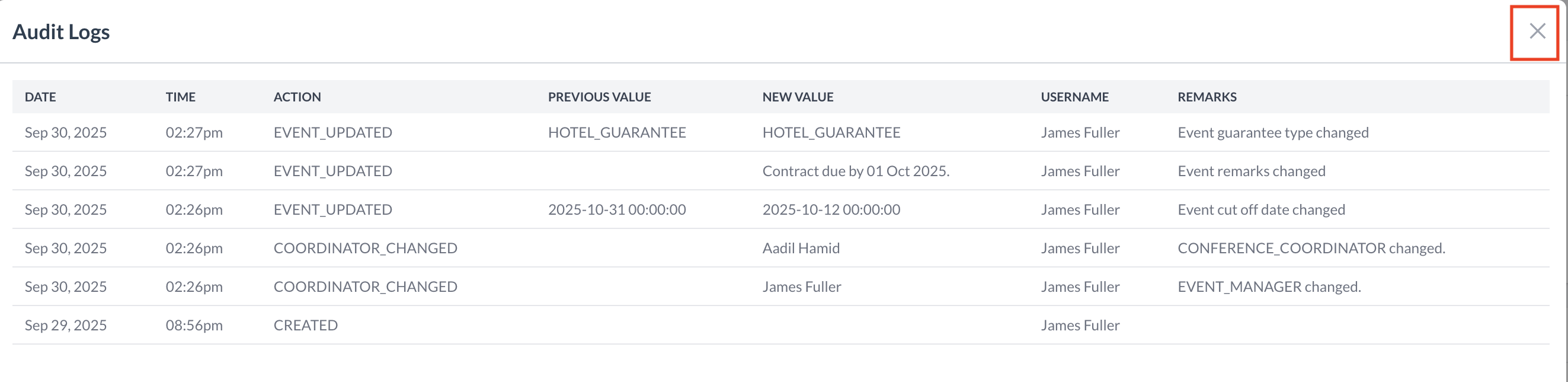 This will open a detailed log of all changes made to the event, including who made the changes and when they occurred. | ![]() Accessing Audit Logs |
