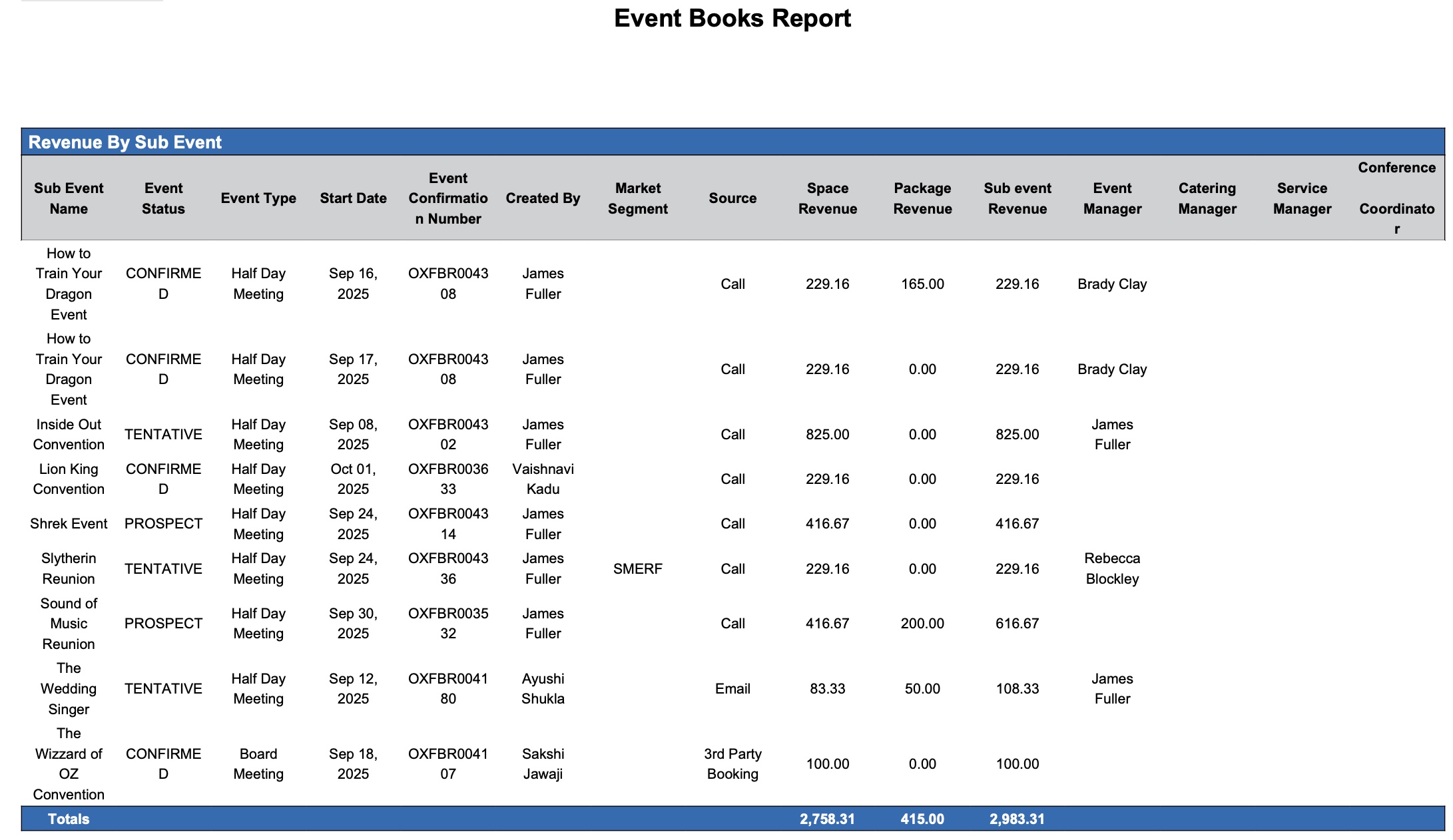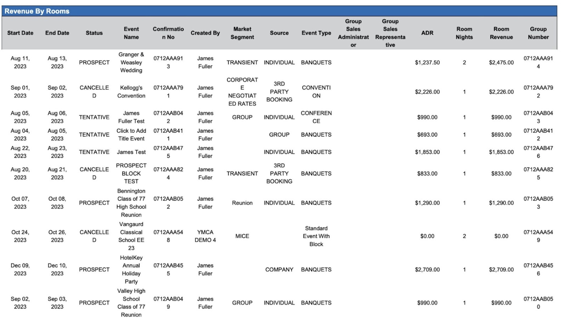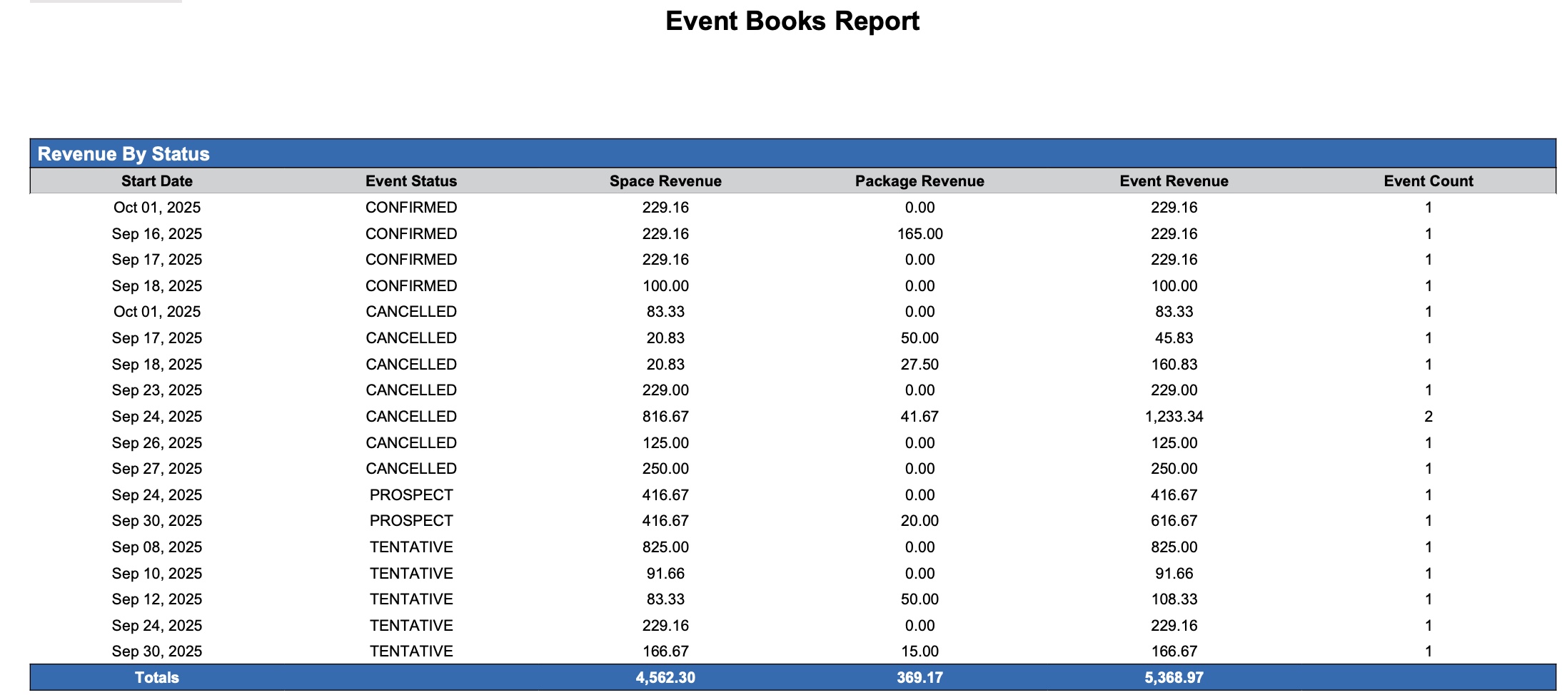The report captures events in all statuses—Canceled, Prospect, Tentative, Confirmed, and Ended—enabling users to analyze performance across the full event lifecycle. Whether evaluating forecasted revenue from tentative bookings or measuring actual revenue from completed events, this report serves as a vital tool for sales tracking, forecasting, and business planning.