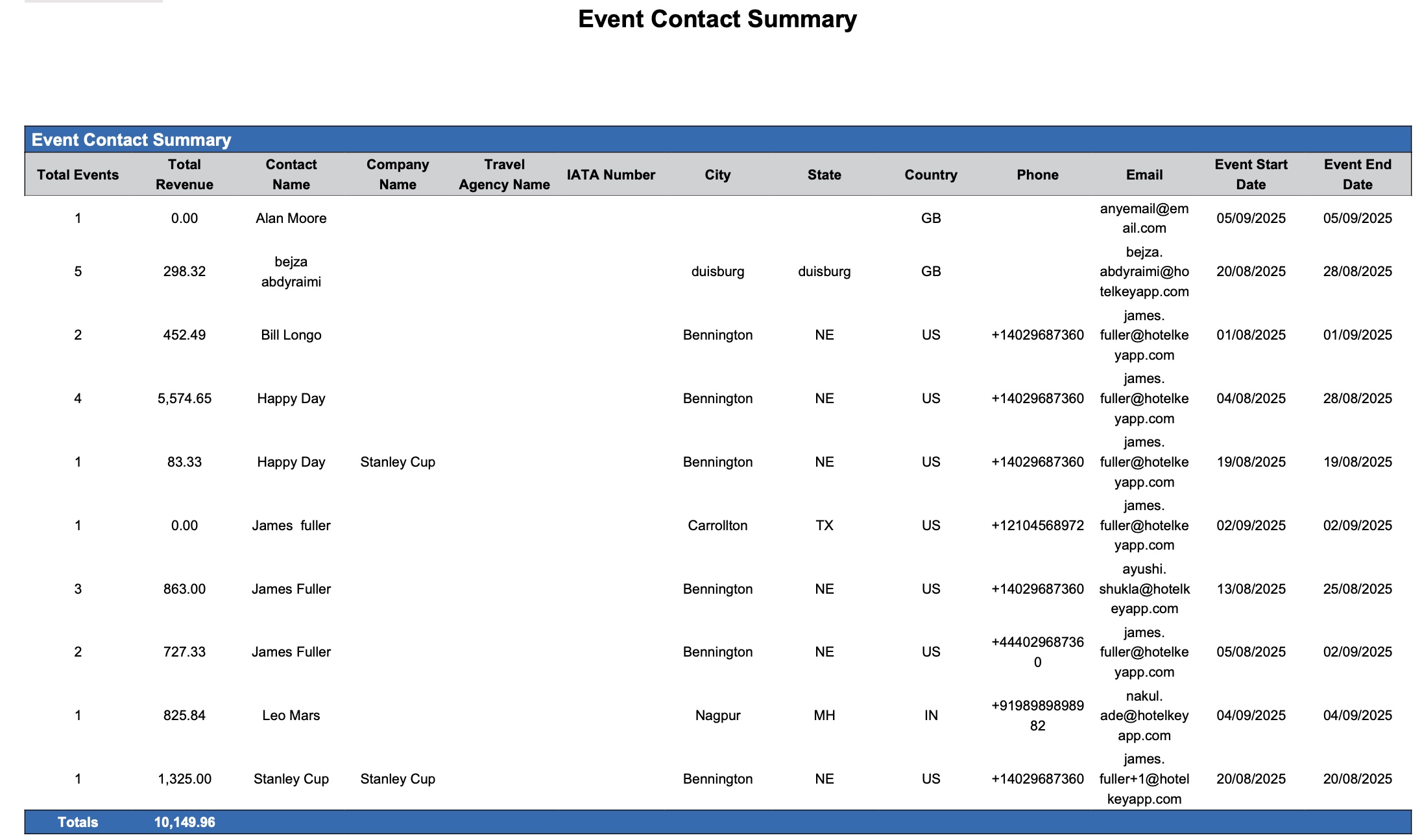 The Contact Summary report offers a high-level overview of event production, organized by lead contact and associated account. This report helps sales and catering teams quickly identify which contacts are generating the most business, providing valuable insights into client engagement and account performance. It includes key metrics such as the number of events, total revenue, and event status, making it a powerful tool for tracking sales efforts, evaluating relationship strength, and identifying opportunities for follow-up or growth within specific accounts.