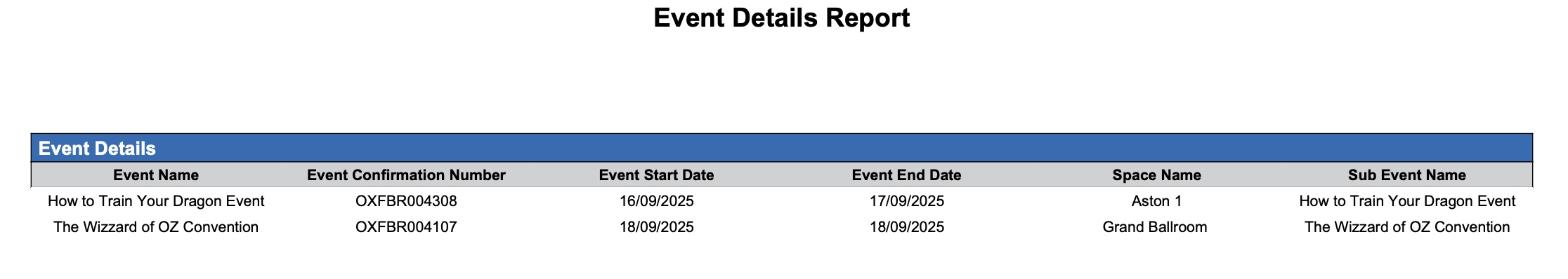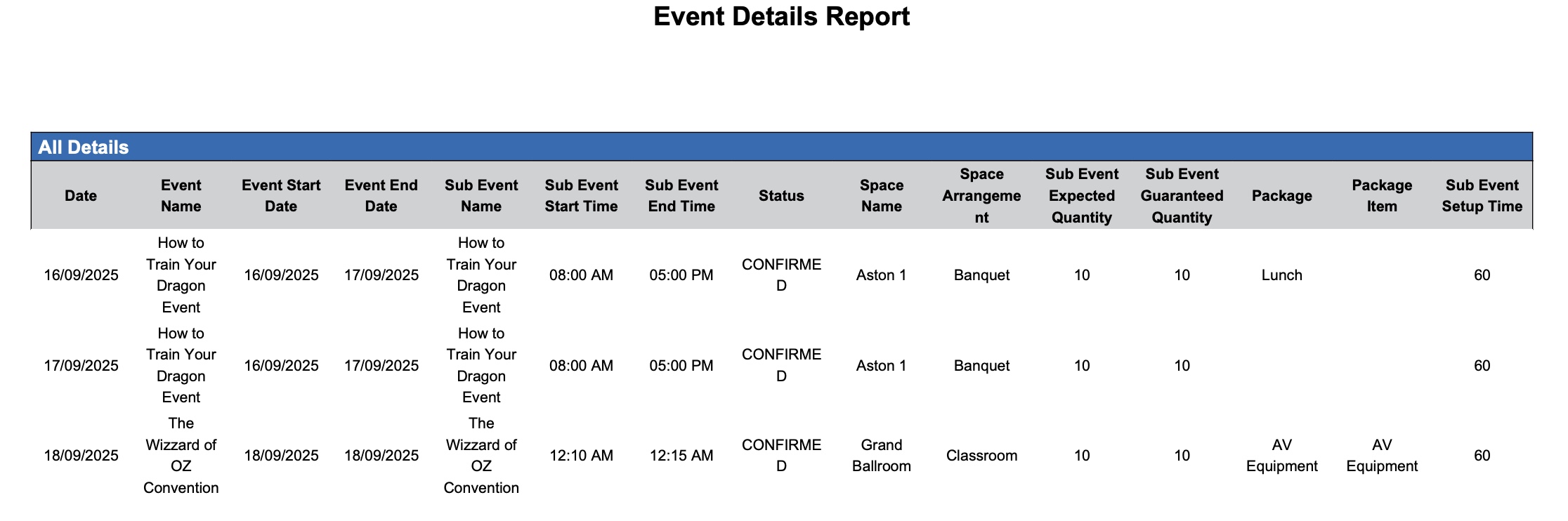 The Event Details Report provides a comprehensive breakdown of event bookings, organized into four distinct sections to support detailed analysis and reporting needs: