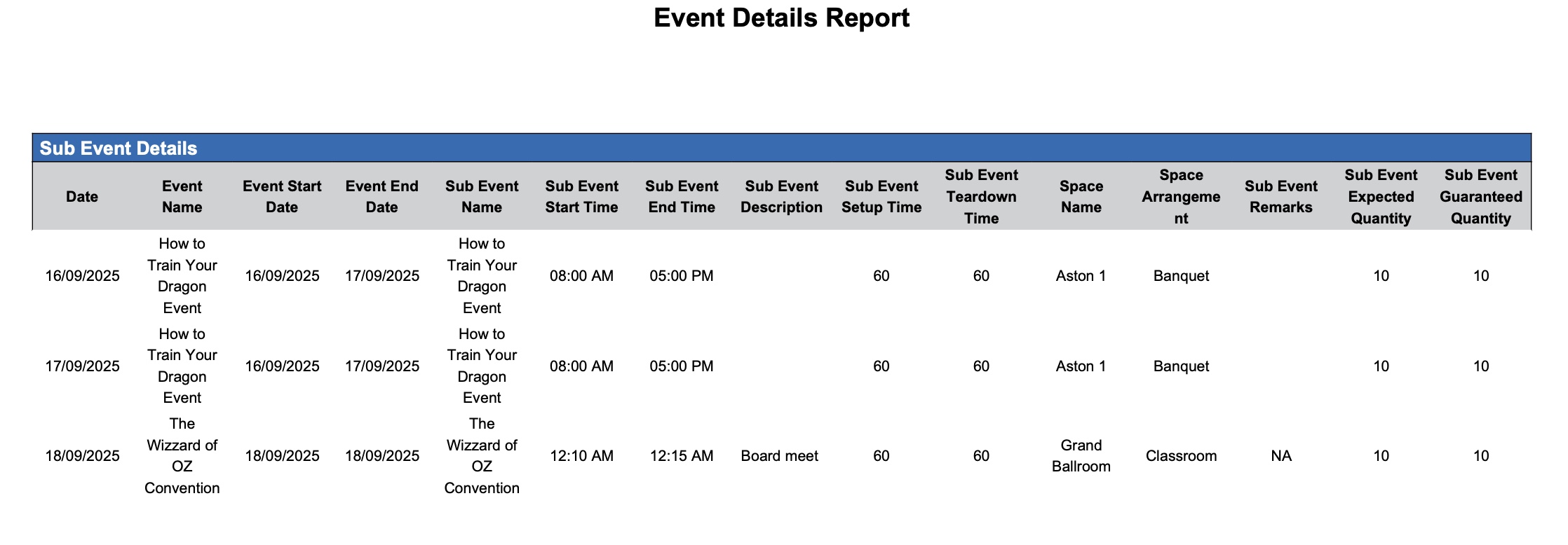 Offers a complete, high-level summary of all event bookings without category-specific filters. Ideal for a quick overview of overall event activity.Sub Event Details