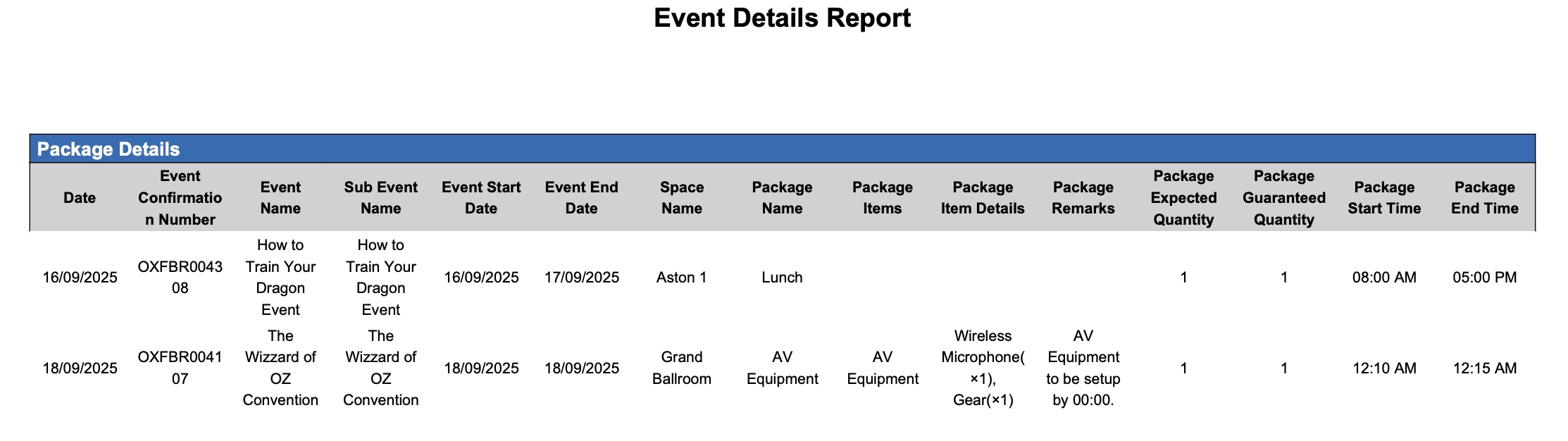 Highlights bookings tied to event packages, providing insight into bundled services, pricing, and package-based revenue.Event Details