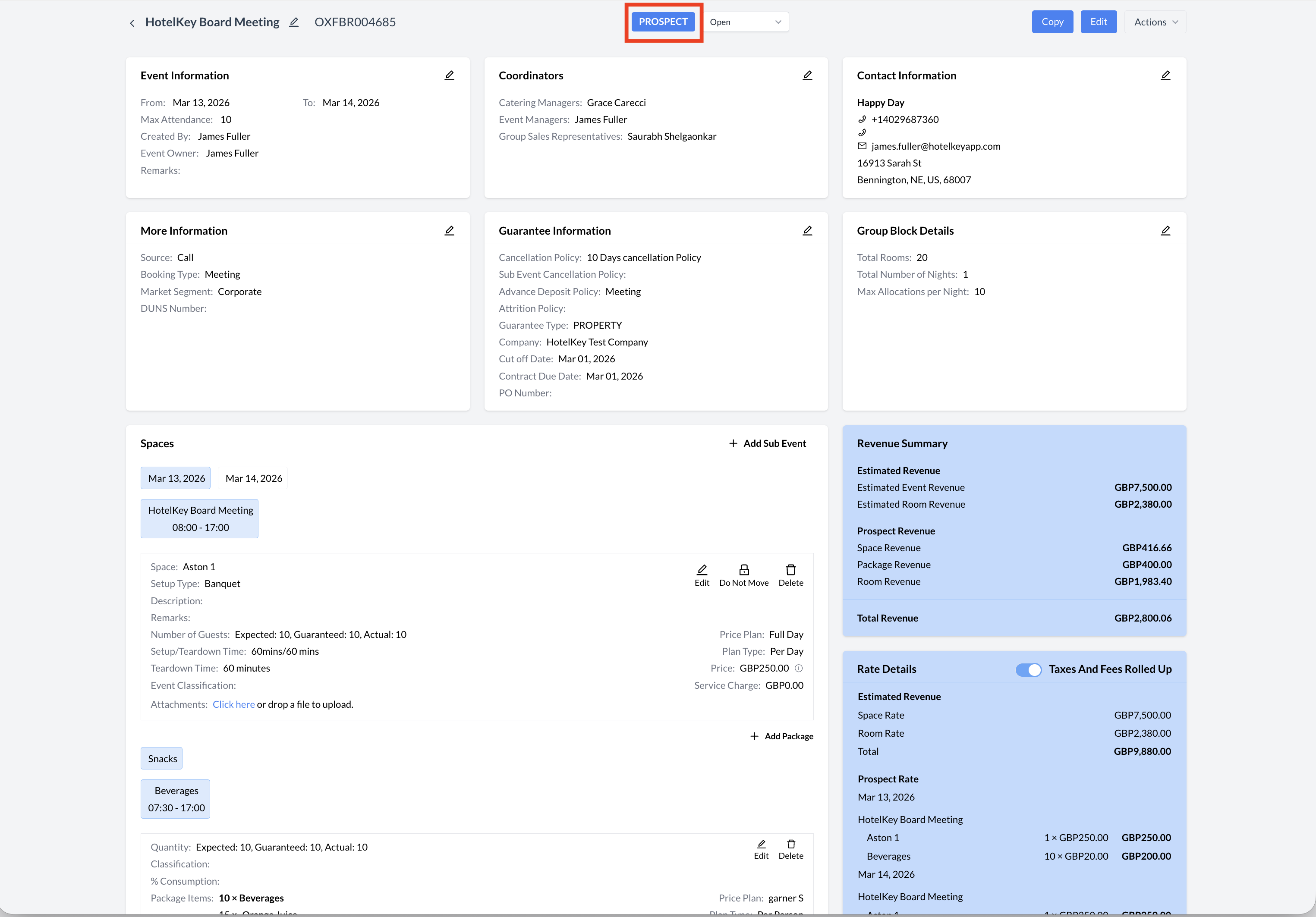 The event life cycle begins when a proposal is created for a potential client or when an inquiry (lead) is marked as won. At this stage, the event is typically assigned a Prospect status. This indicates that the event is still under evaluation, and no space, rooms, or resources have been officially reserved. The Prospect status is primarily used to track early-stage interest and initial communication with the client. If a group block is created while in this status, it will also be sent to the Property Management System (PMS) as a Prospect. Important: