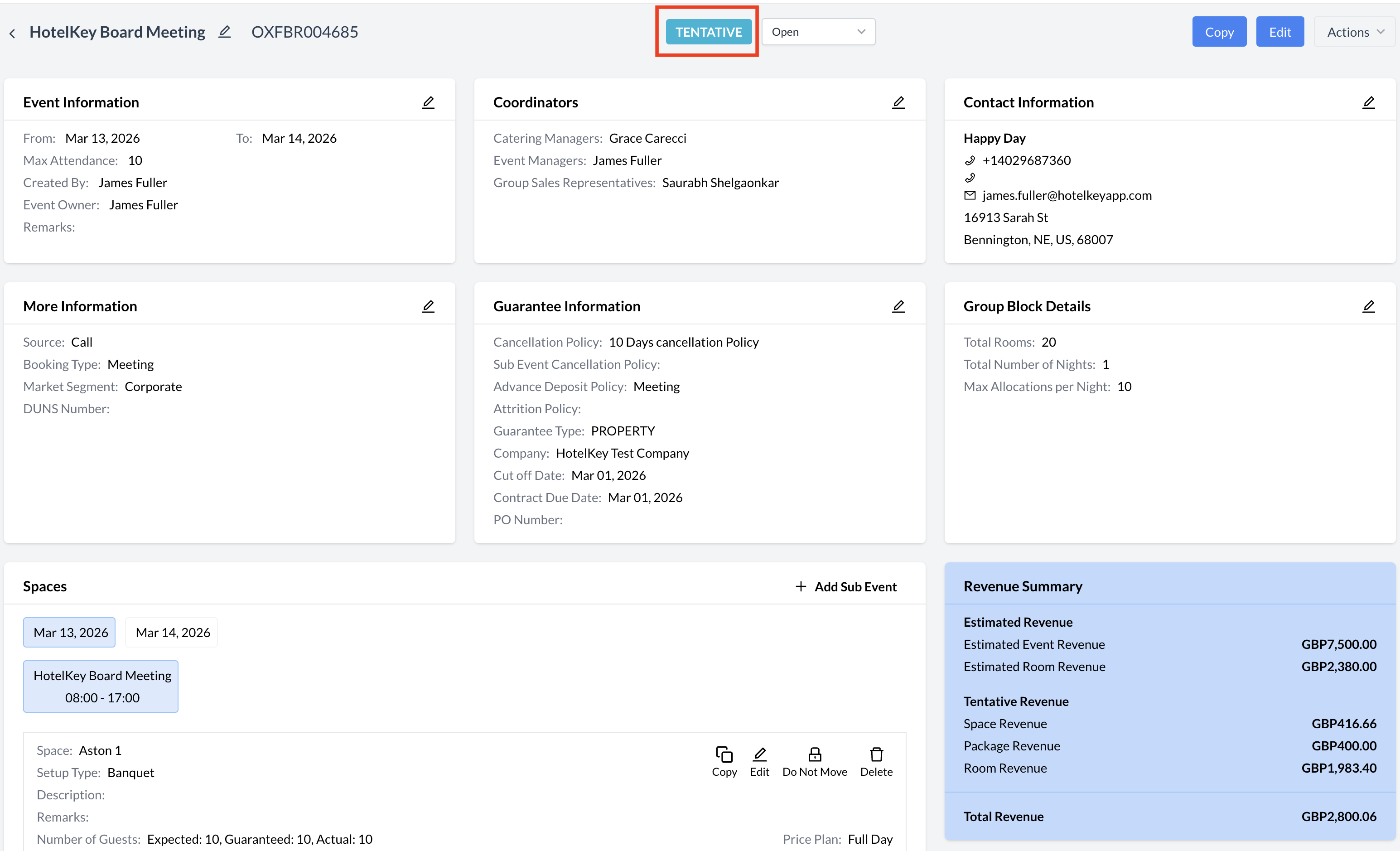 Updating an Event to Tentative StatusWhen a client provides a verbal agreement or expresses strong interest in booking, the event should be updated to Tentative status. This status indicates that space has been held for the client; however, a signed contract has not yet been received. Marking an event as Tentative reserves the necessary space and resources, allowing the client time to confirm their decision without risking availability. How to Promote an Event to Tentative: