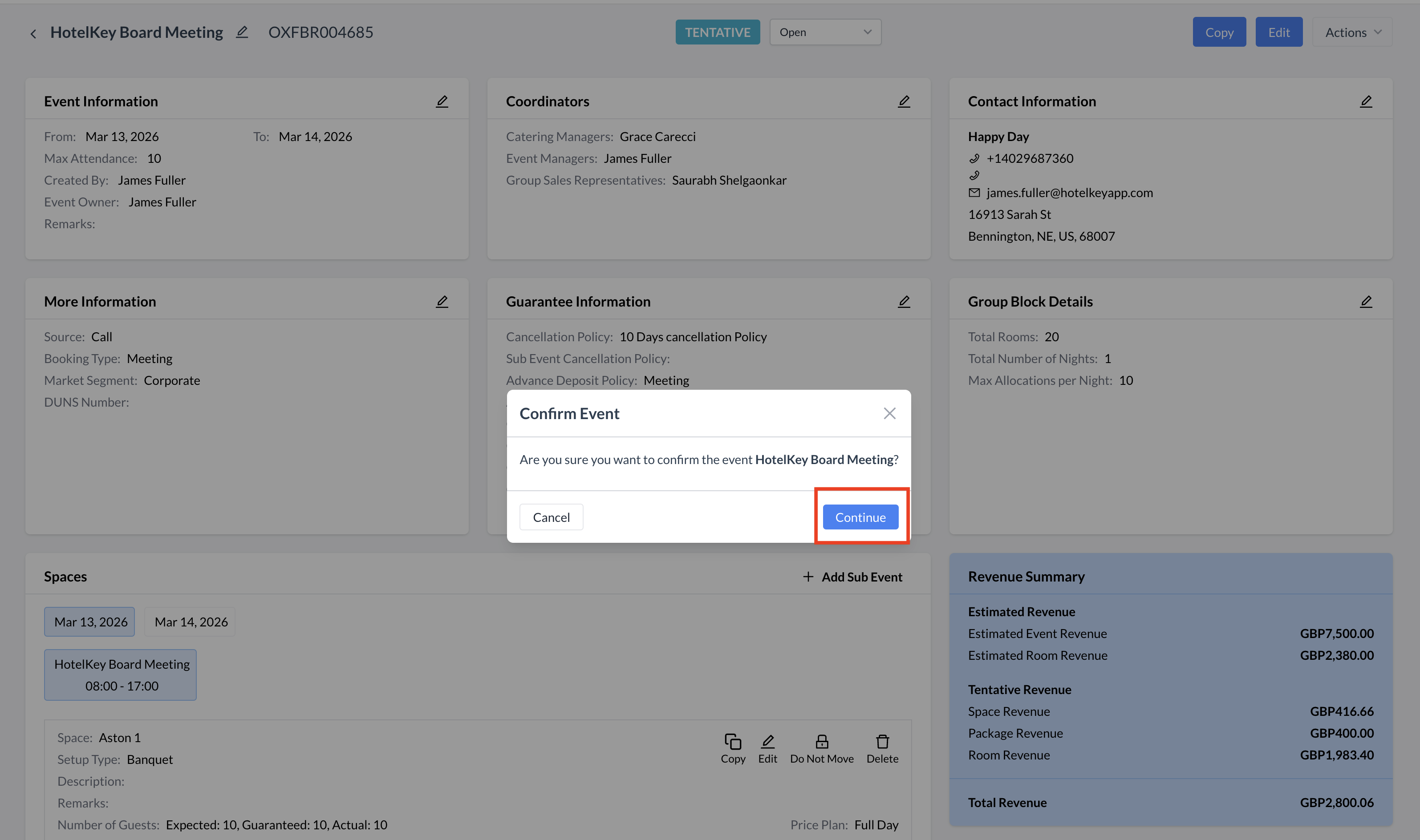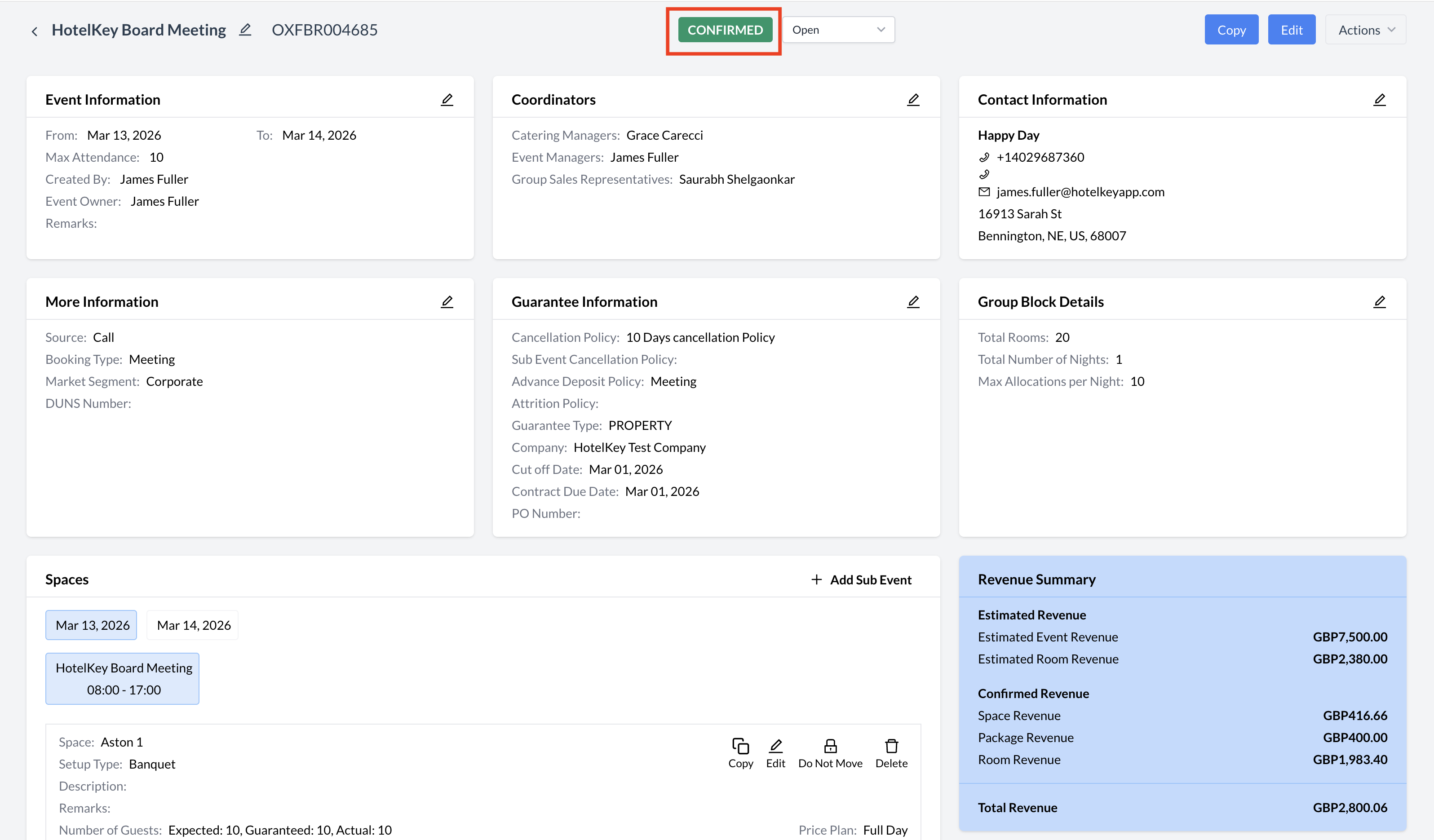 Promoting an Event to Confirmed StatusOnce the signed contract has been received and any required deposit has been collected, the event should be updated to Confirmed status. This status reflects a formal commitment from the client and signals that internal teams can begin detailed planning and execution. Events in Confirmed status are considered definite business. How to Promote an Event to Confirmed: