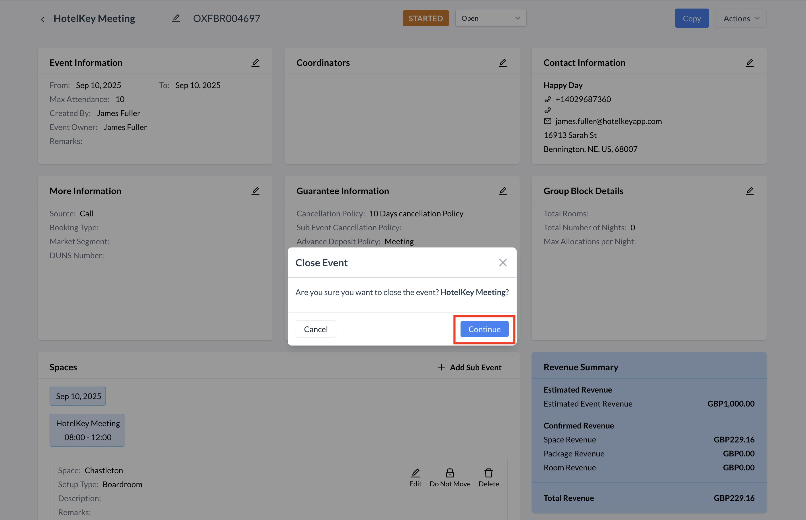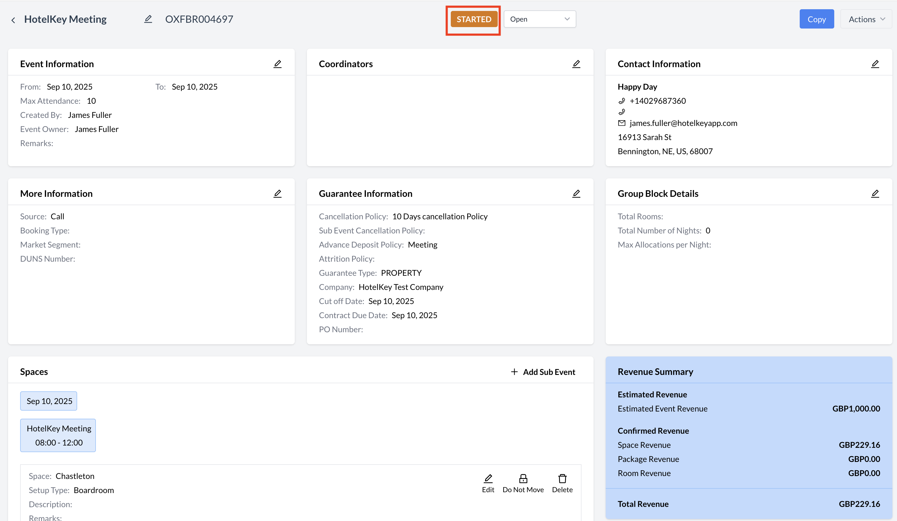 Event Transition to Started StatusAs the event date arrives, any event in Confirmed status will automatically transition to Started status. This status indicates that the event is actively taking place and signals operational teamsโsuch as Banquets, AV, and Cateringโto begin service execution based on the finalized event details. How the Event Transitions to Started:There is no manual action required to update an event to Started status. This change occurs automatically during Night Audit as EventKey advances to the current business day of the event.