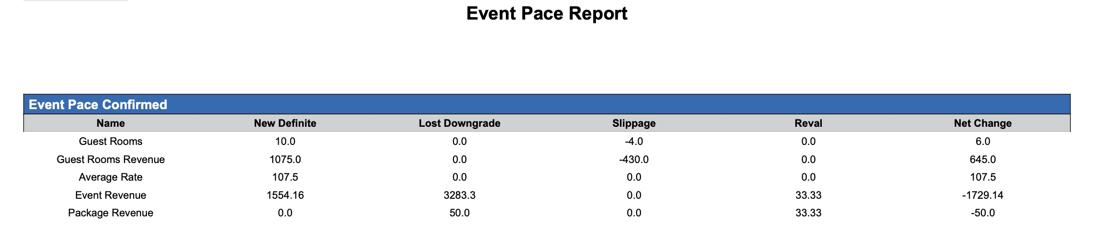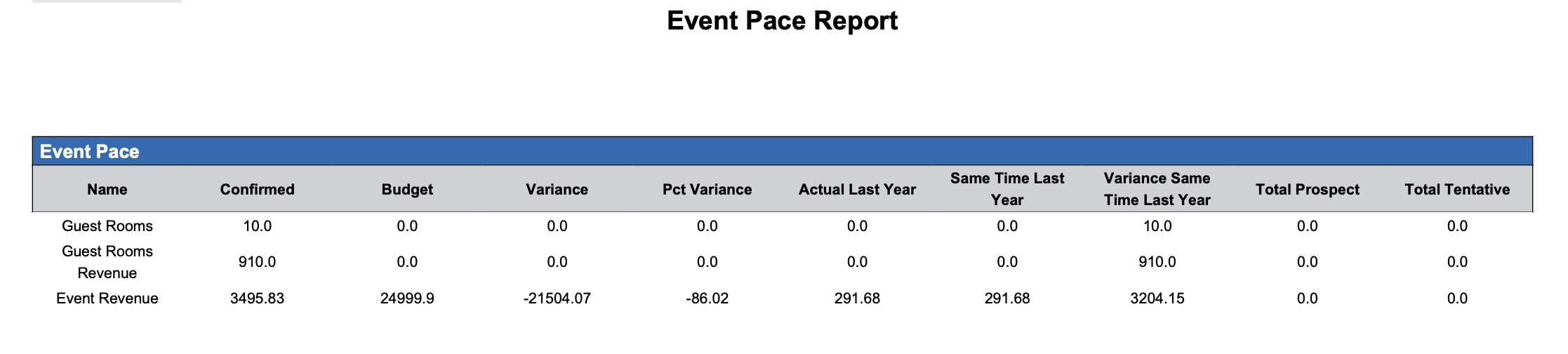 The Event Pace Report provides a comprehensive view of current business performance by allowing users to measure pace relative to budget and compare confirmed guest room revenue, event production, and package production against last year's actuals. It enables hotel teams to: