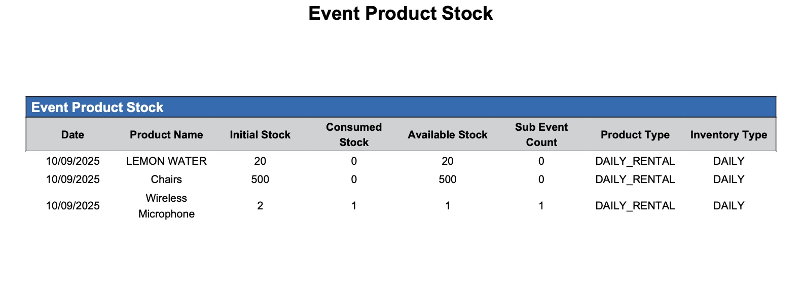 Event Product Stock Report