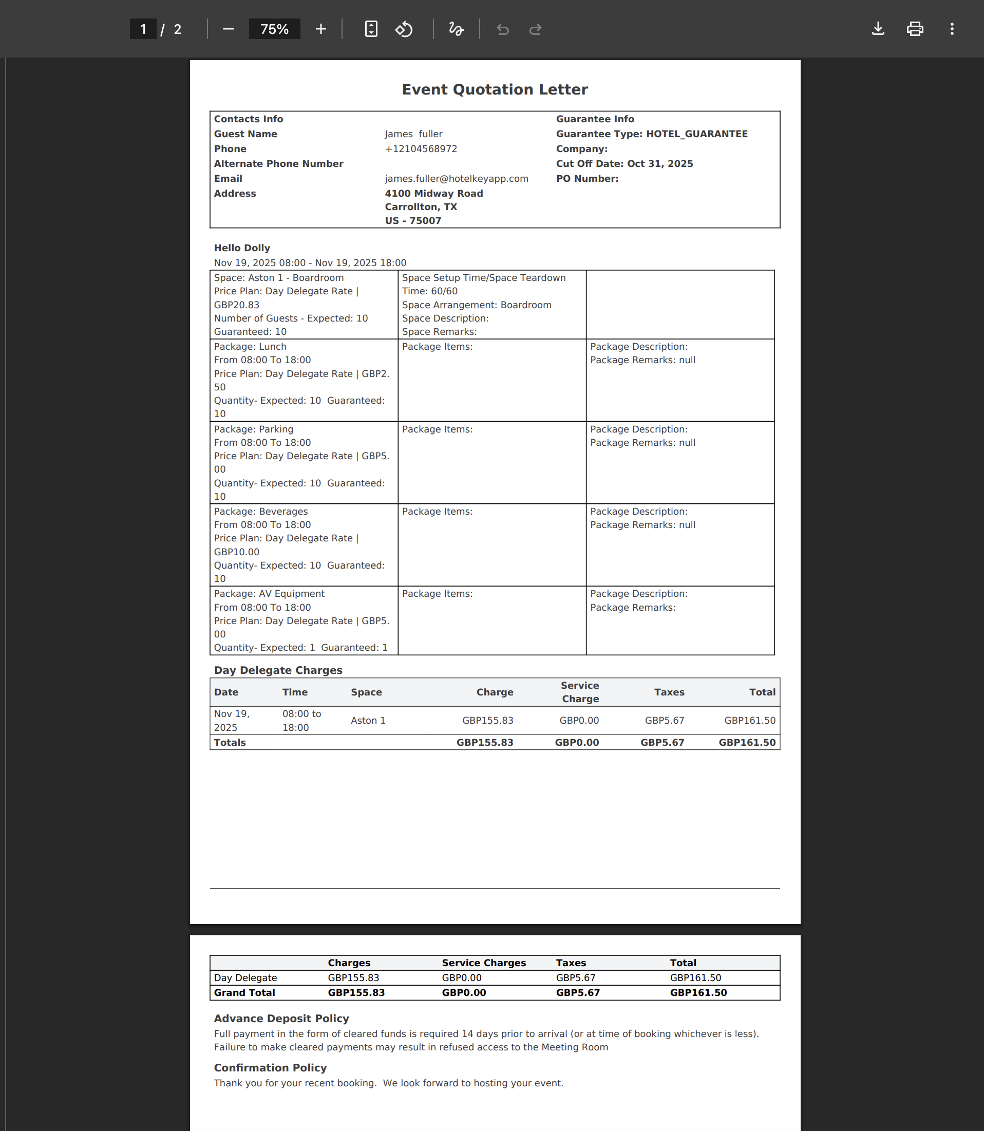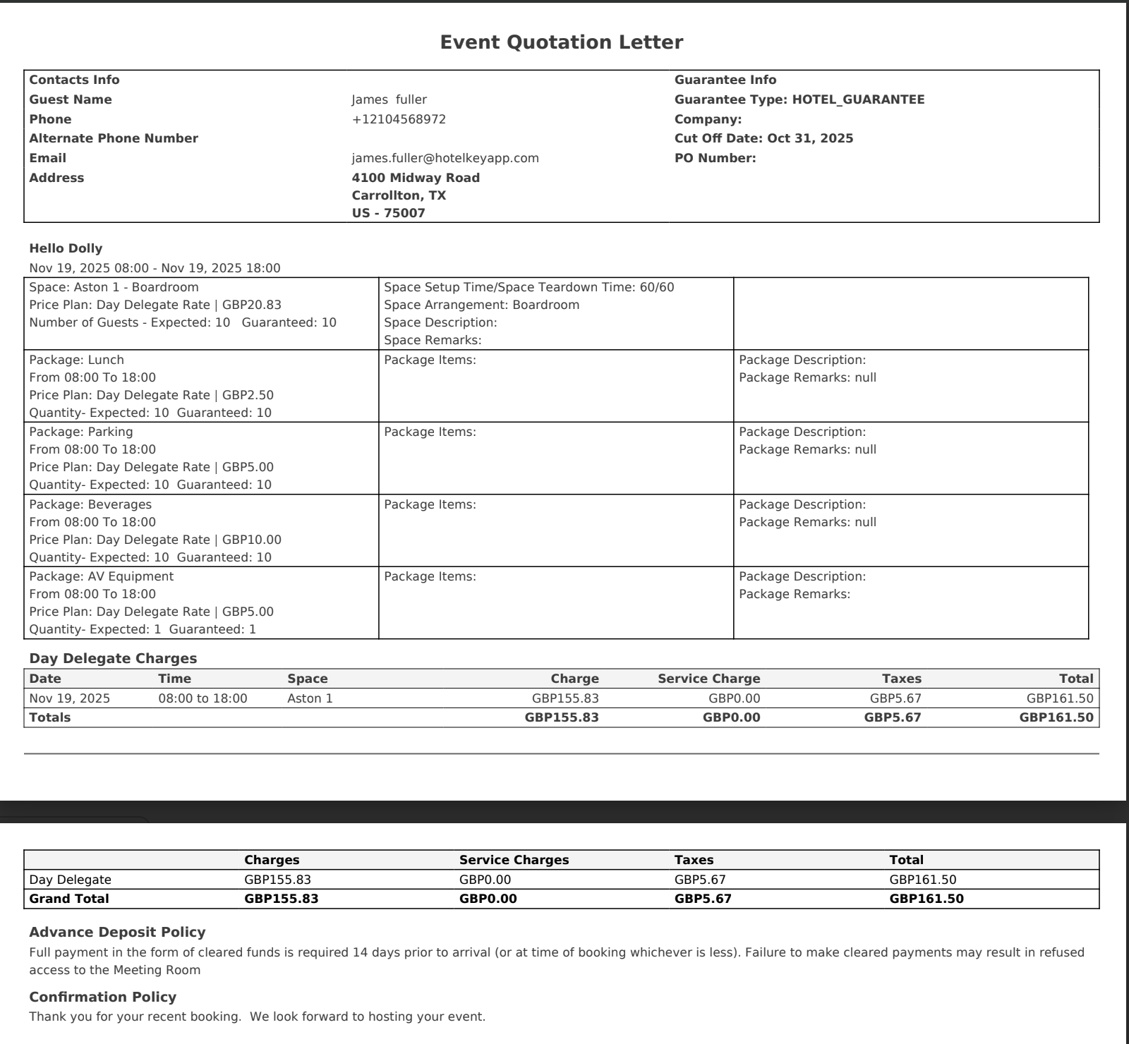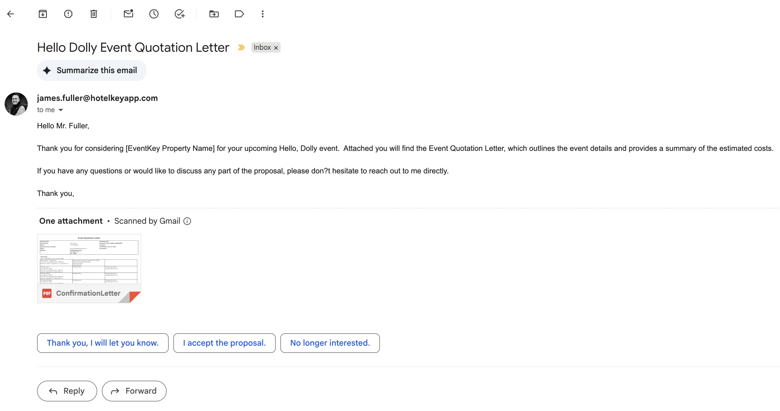 The guest will now receive the Event Quotation Letter in their inbox, with the letter included as a PDF attachment. | ![]() Event Quotation Email Example ![]() Event Quotation Letter PDF |