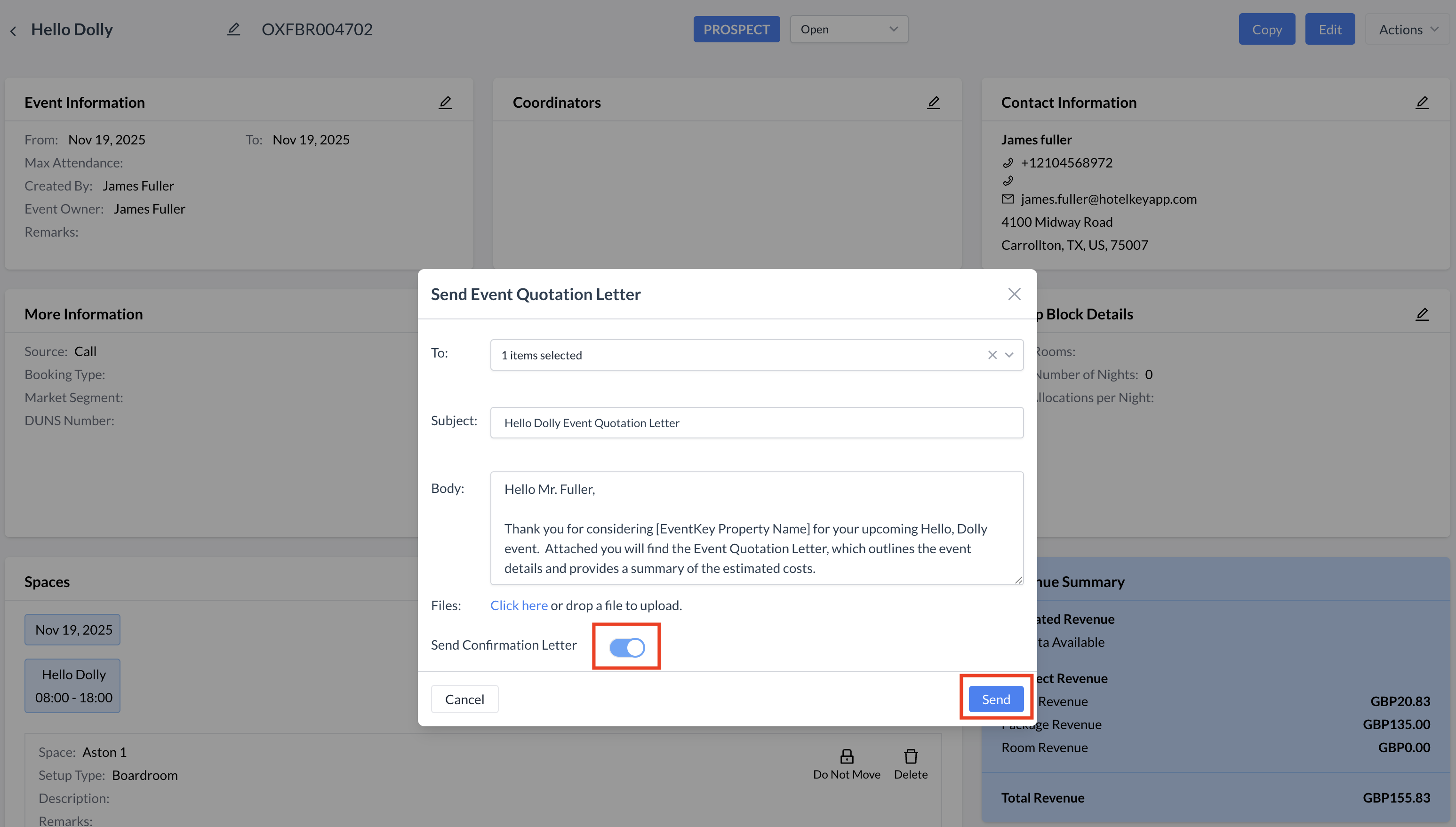 The Event Quotation Letter can also be sent directly to the guest via email from within EventKey. To do this, navigate to the Event Reservation screen and click on the Actions menu located in the upper-right corner. From the dropdown list, select Send Event Quotation Letter. This will open the email configuration screen where you can review and send the letter directly to the guest. | ![]() Send Event Quotation Letter |