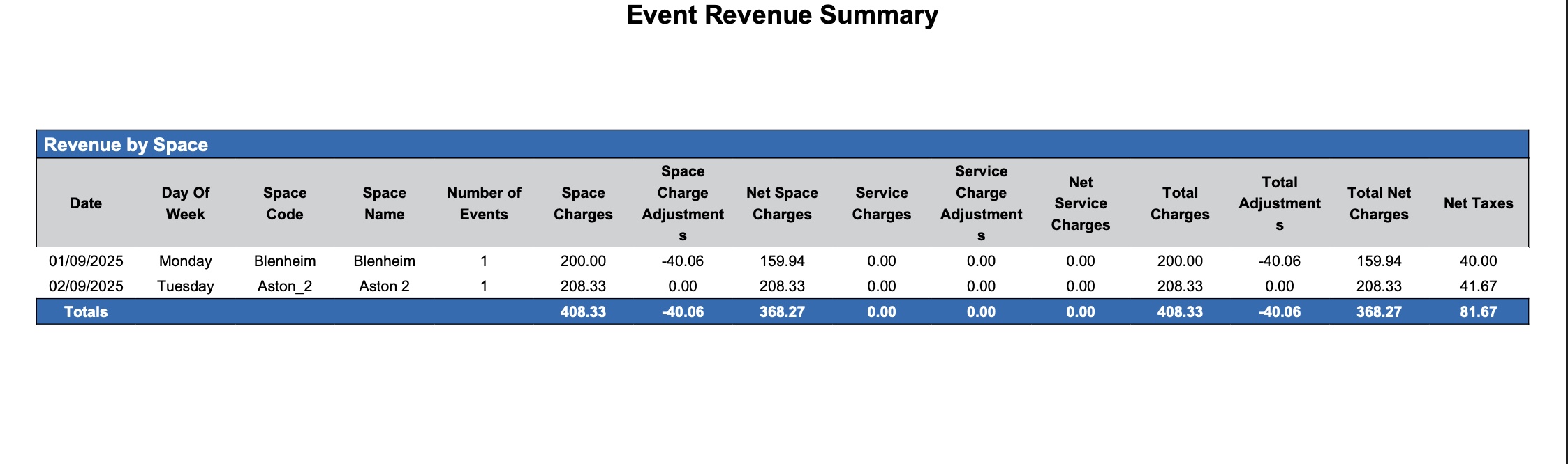 Space Charges | The total amount charged for renting the space. |