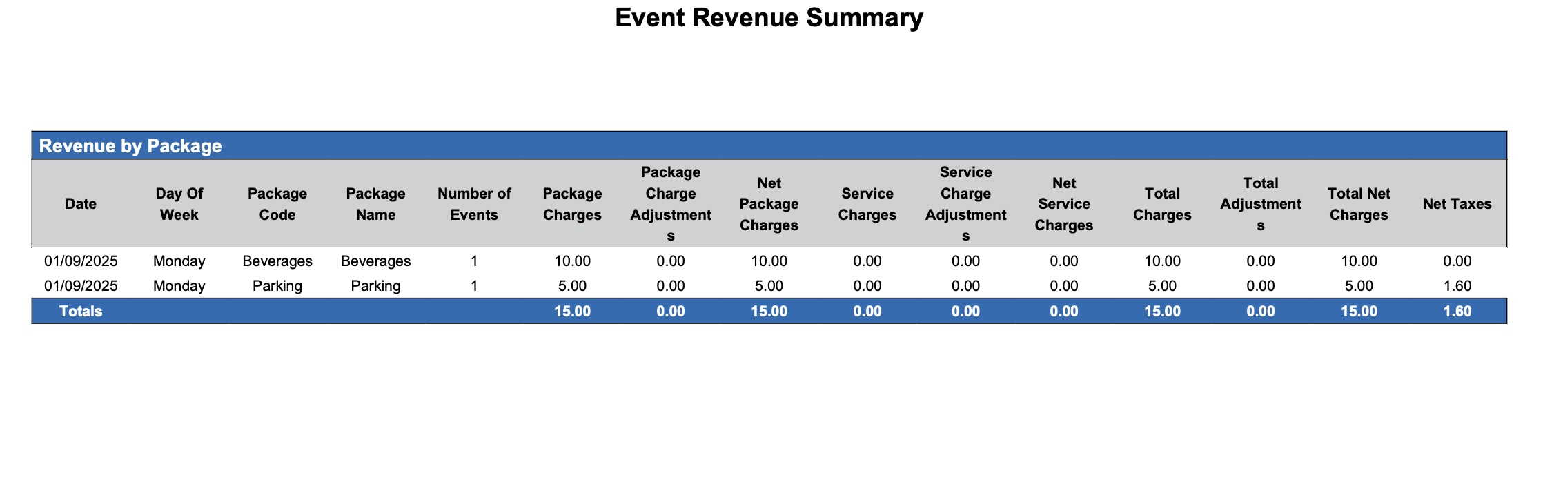 Net Package Charges | The final amount remaining after all package adjustments, such as discounts or credits, have been deducted from the total package charges. |