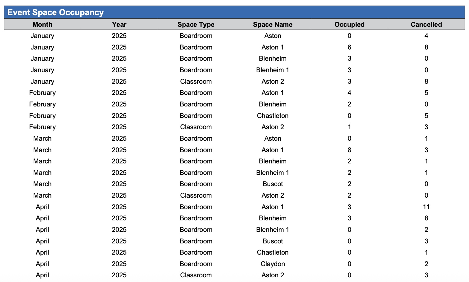 Cancelled | Indicates how often a space was booked for an event that was ultimately canceled before it occurred. |