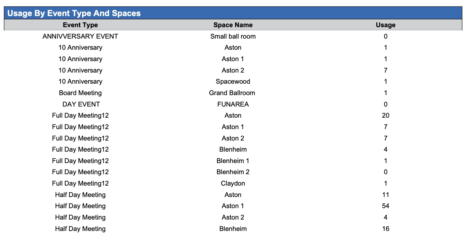 Event Space Occupancy Report - Usage by Event Type and Spaces Section
